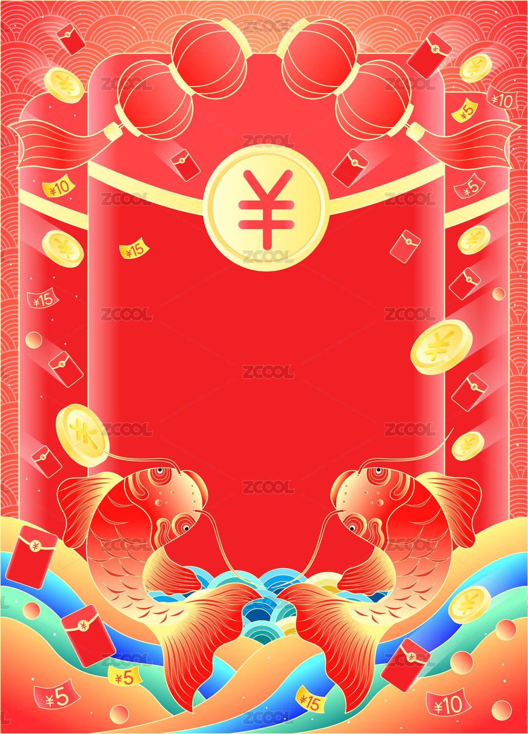 锦鲤灯笼热闹红包雨来袭优惠券飘飞矢量插画