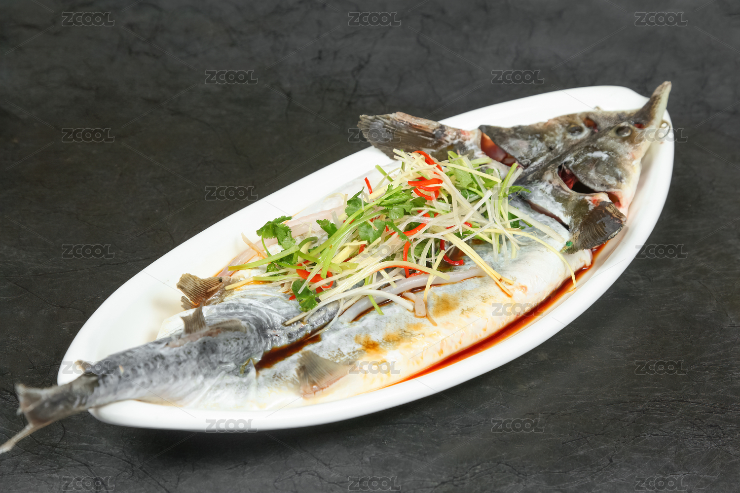 白盘里的粤菜广式葱丝耗汁清蒸鱼