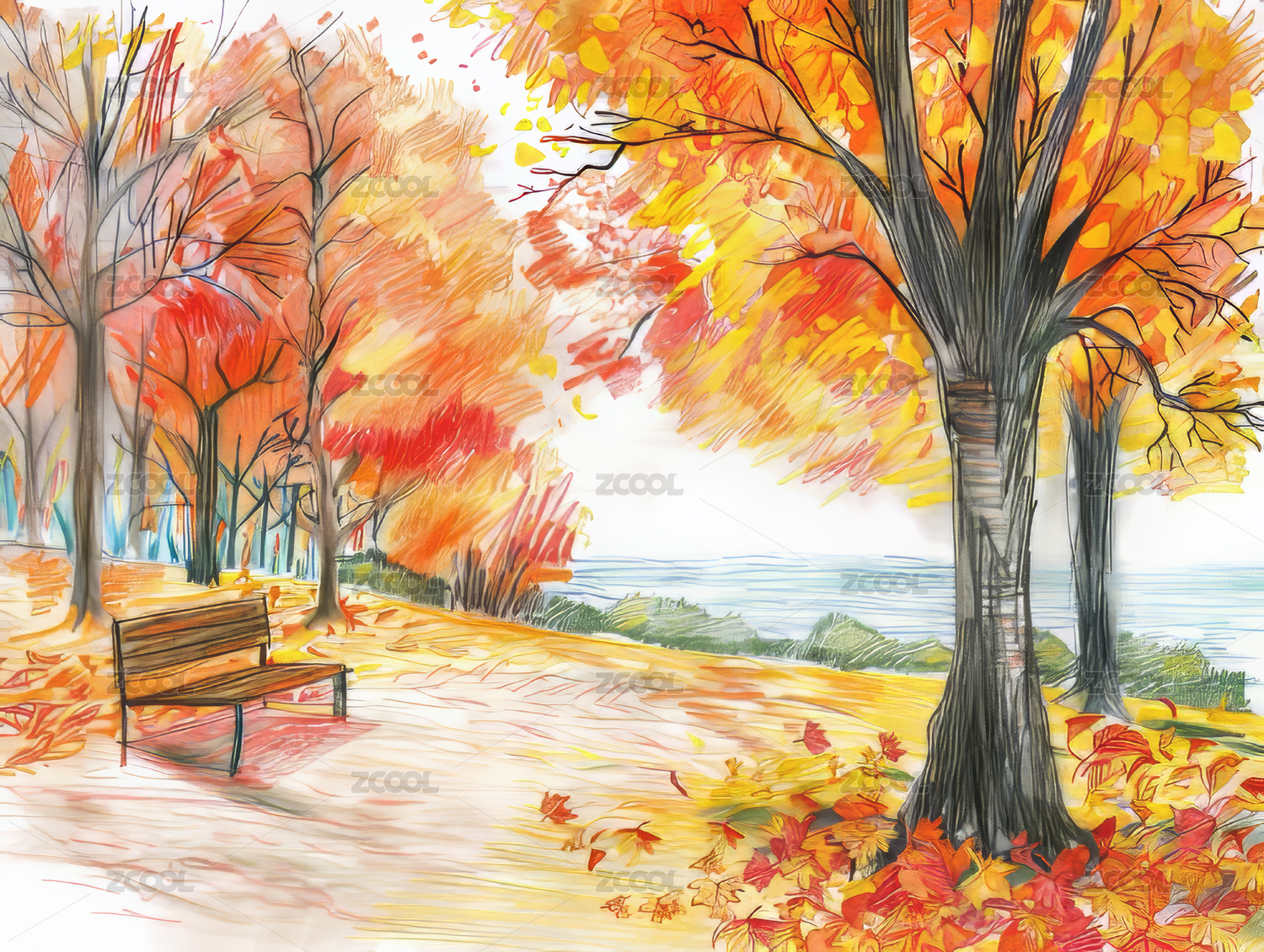 秋季风景插画水彩风格