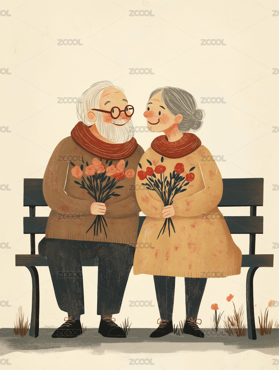 温馨可爱的老年夫妇水彩插画
