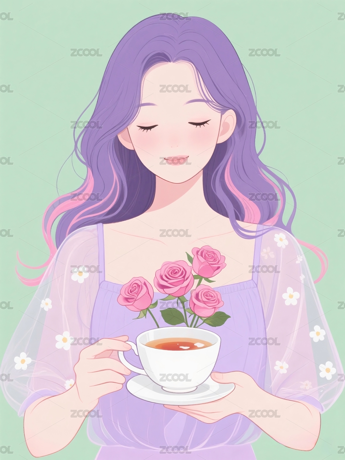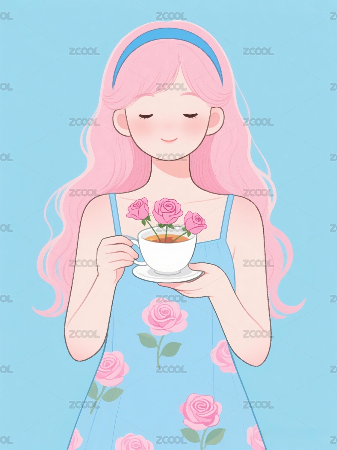 插画,玫瑰,花茶,杯子,女孩,红色,粉色,花瓣,清新,休闲