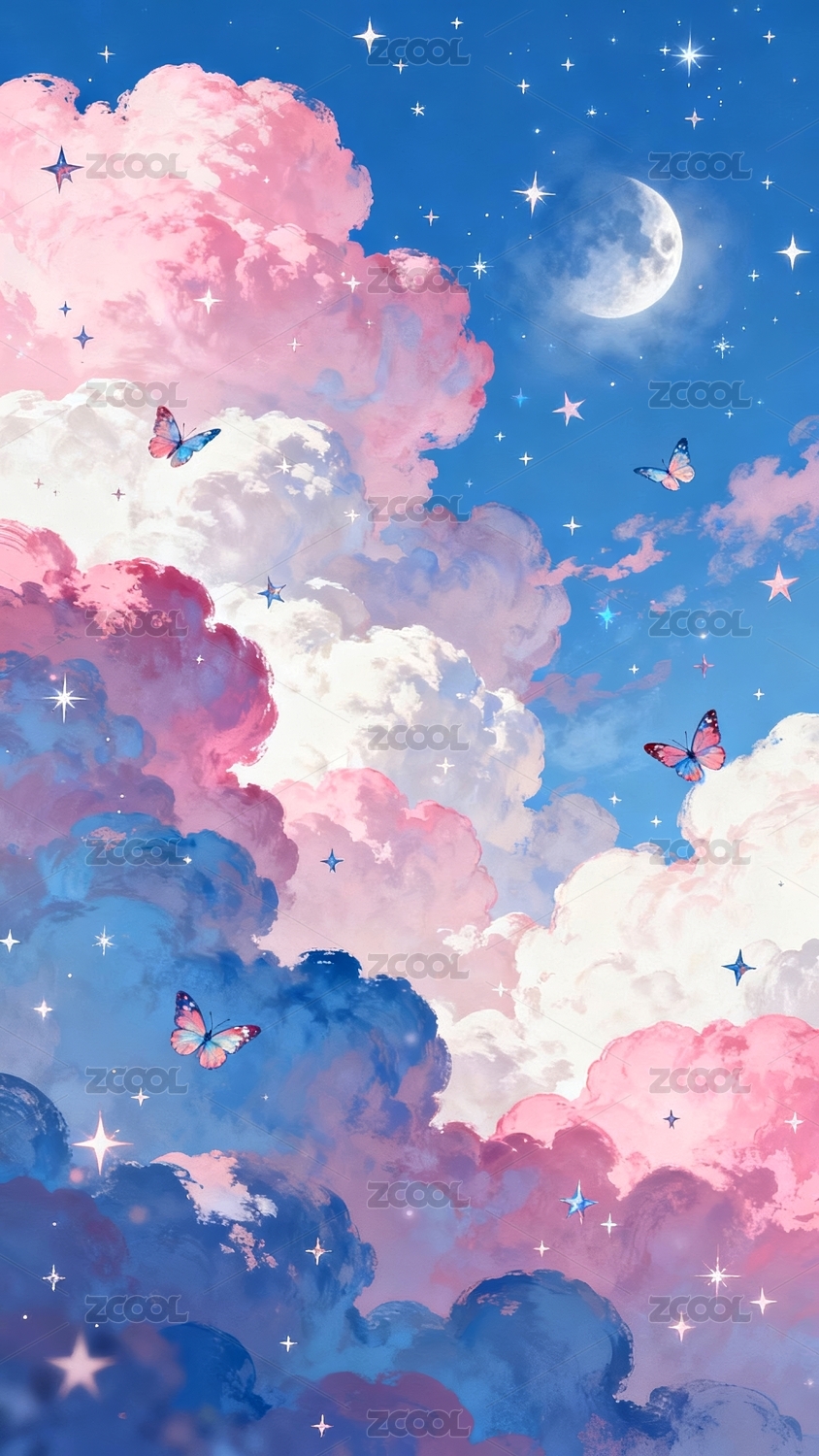 粉色,云朵,花朵,蝴蝶,星空,梦幻,唯美,浪漫,轻盈,柔软
