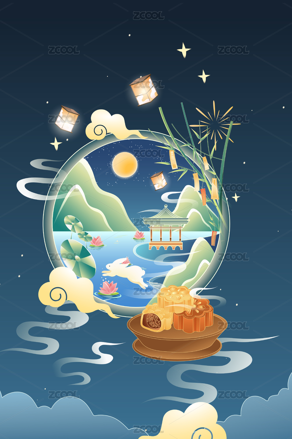 中秋,中秋节,玉兔,兔子,月亮,孔明灯,月饼,仙鹤,国风,国潮