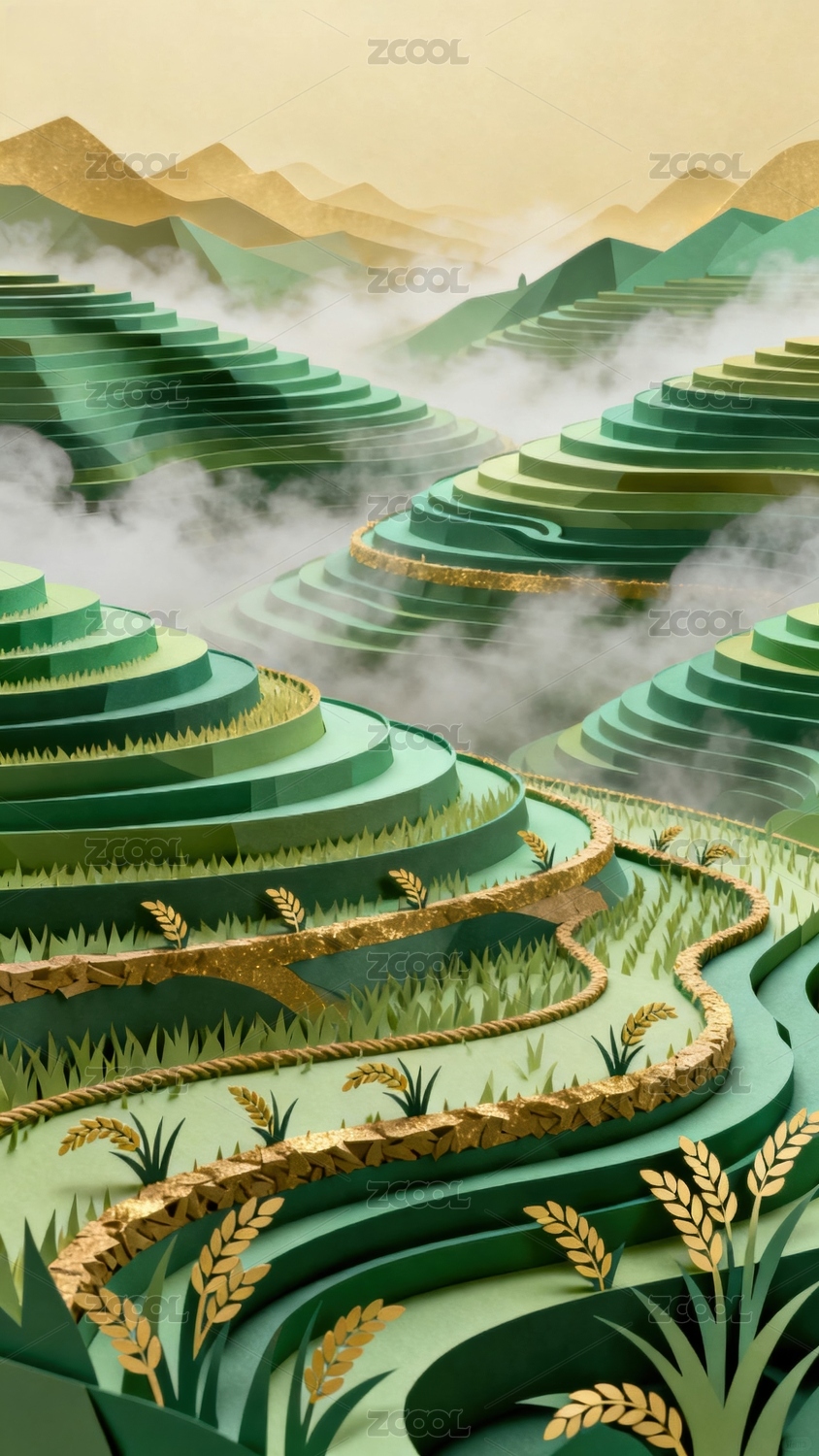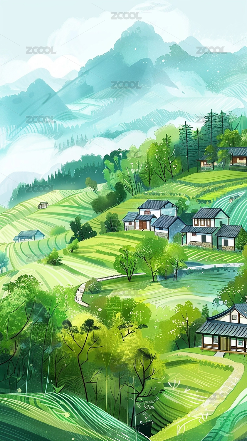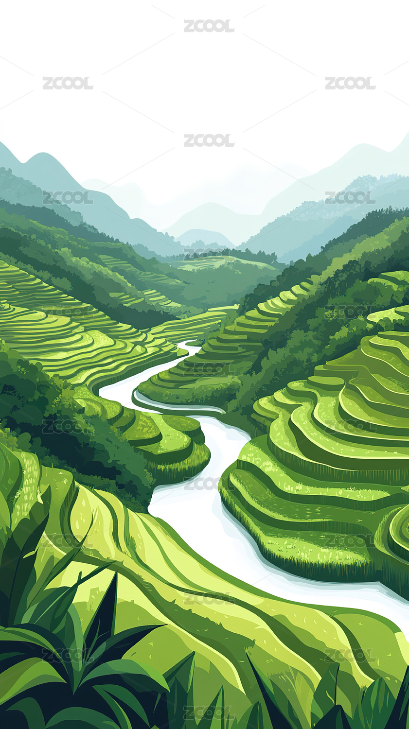 初春季节麦田里刚长出嫩黄的芽农民伯伯在田间耕种中间有溪水串流而过