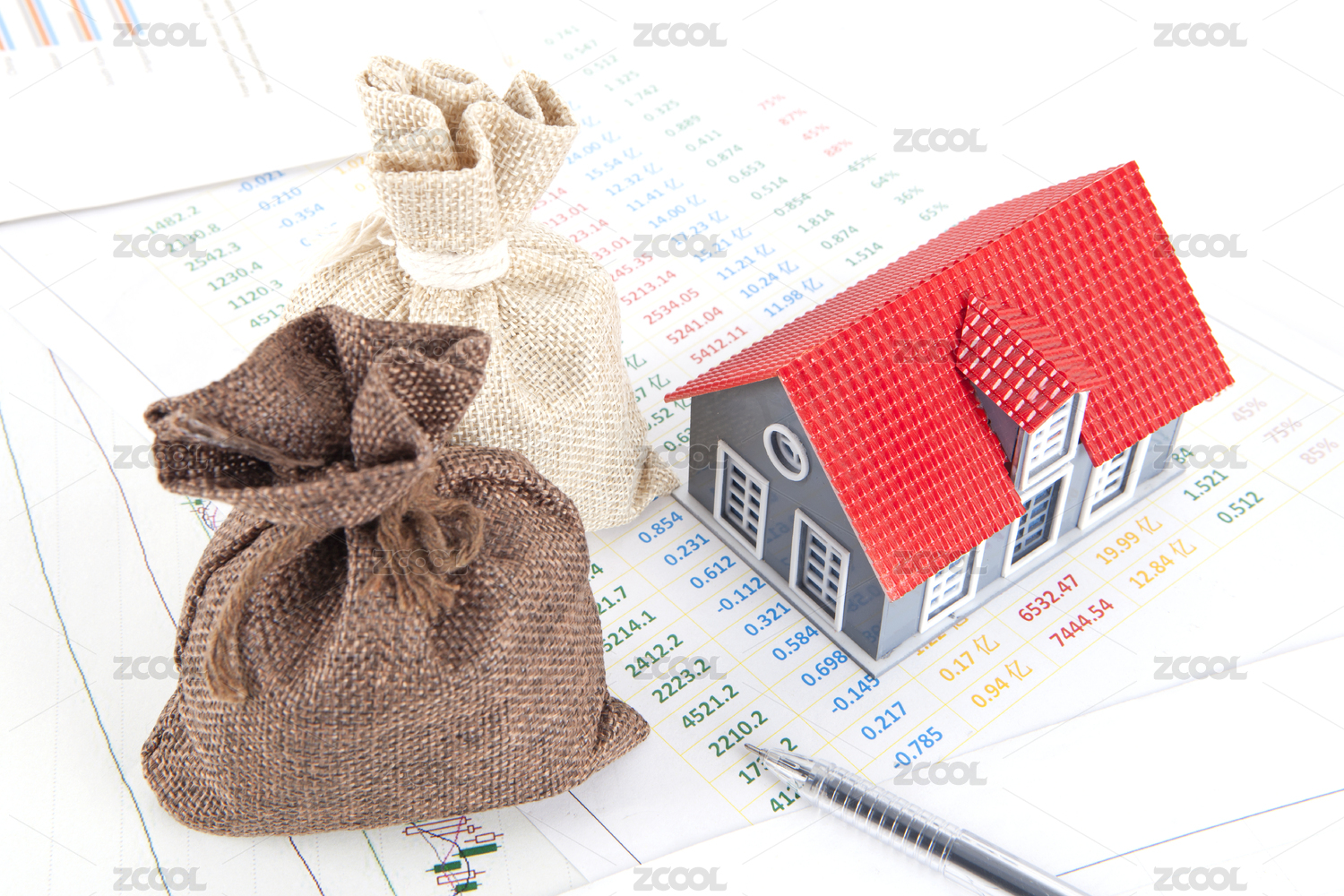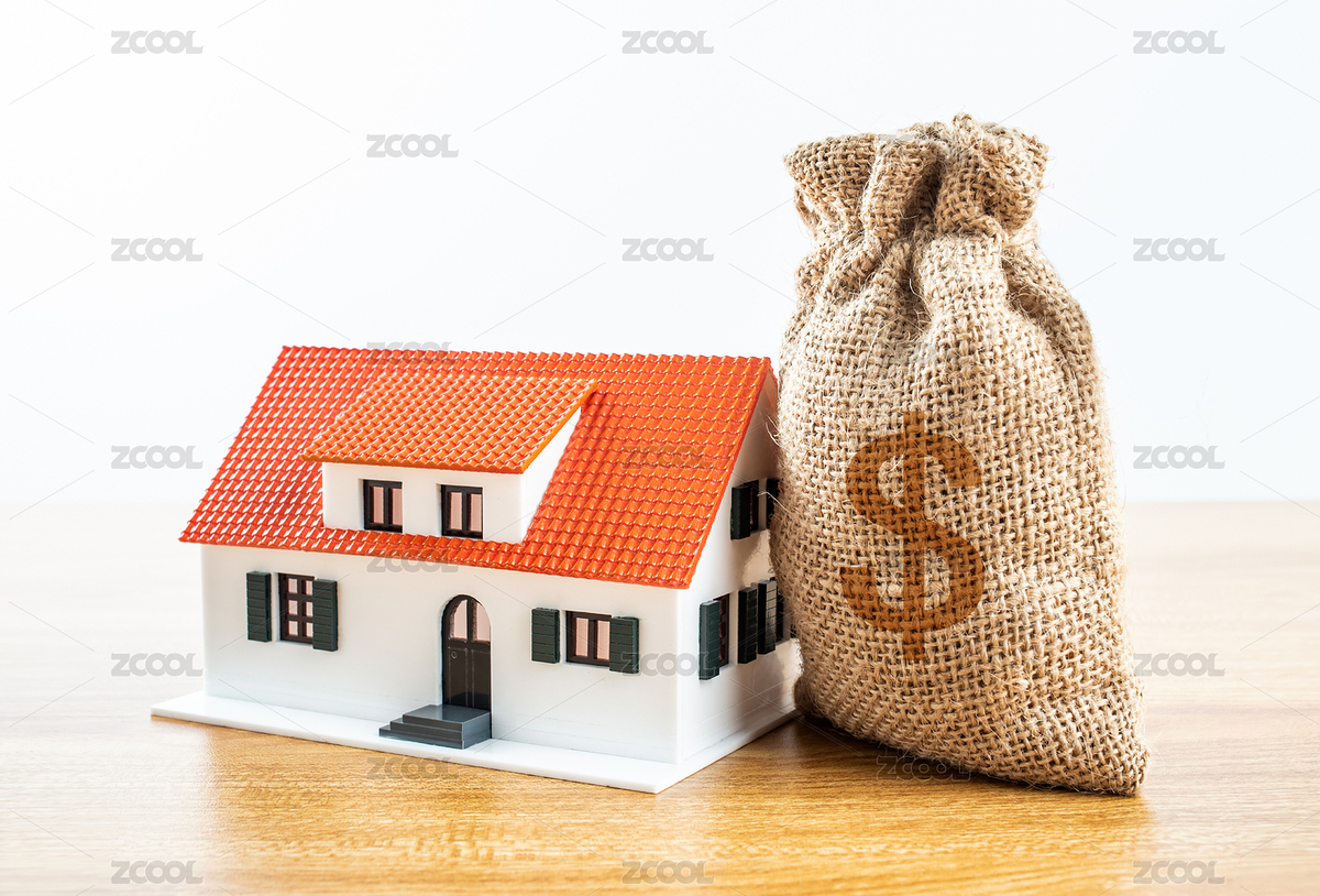 办公桌上一袋子金钱和一栋小房子模型
