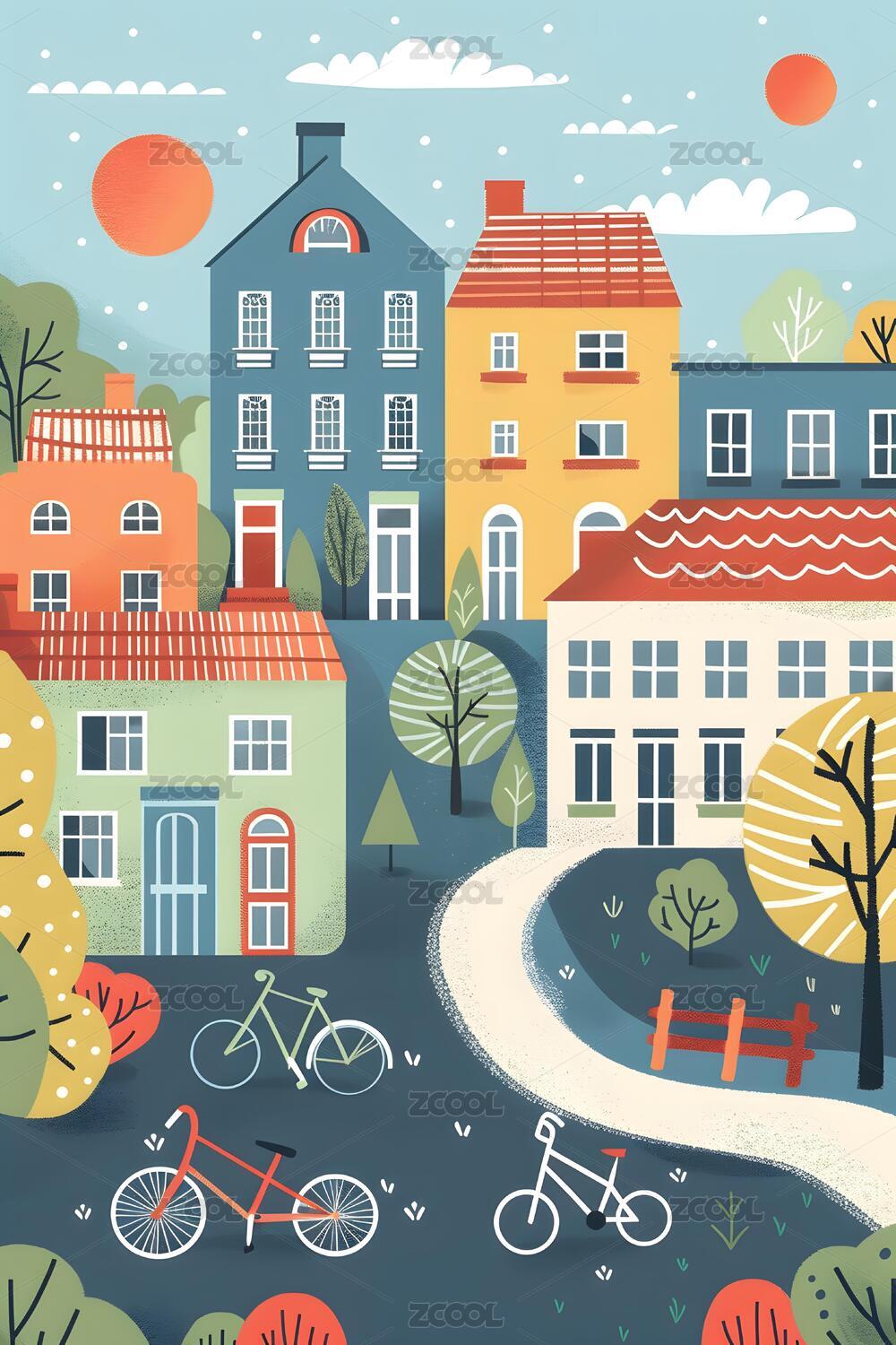 卡通立春骑自行车踏青城市风景矢量背景插画