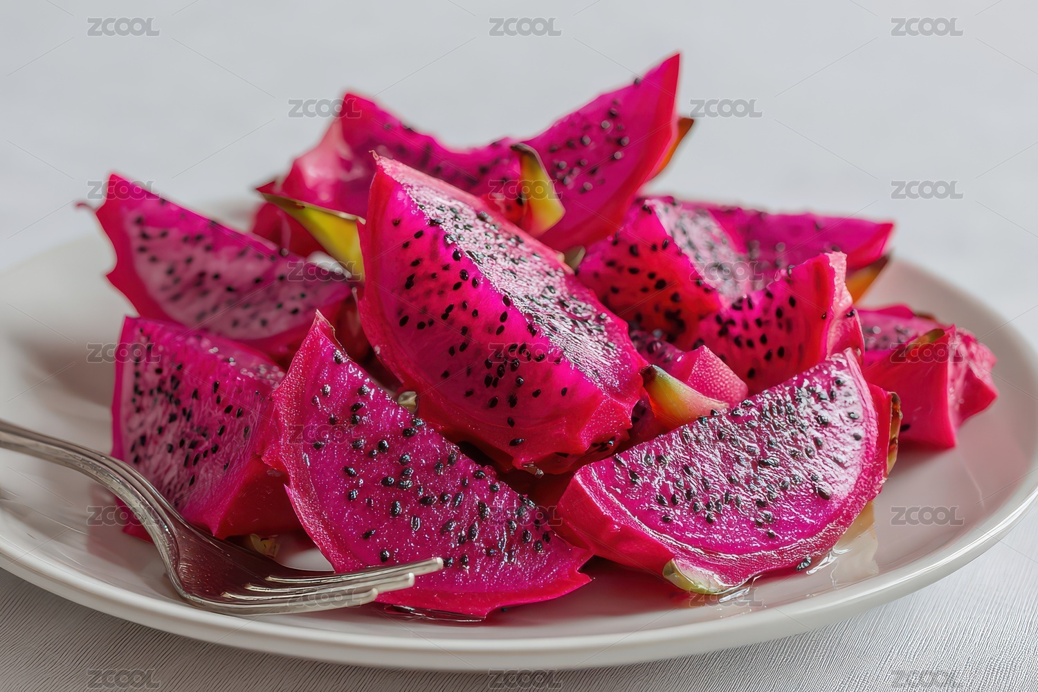 红心火龙果,火龙果,红心,果肉,切块,切开,一碗,金色叉子,叉子叉,健康