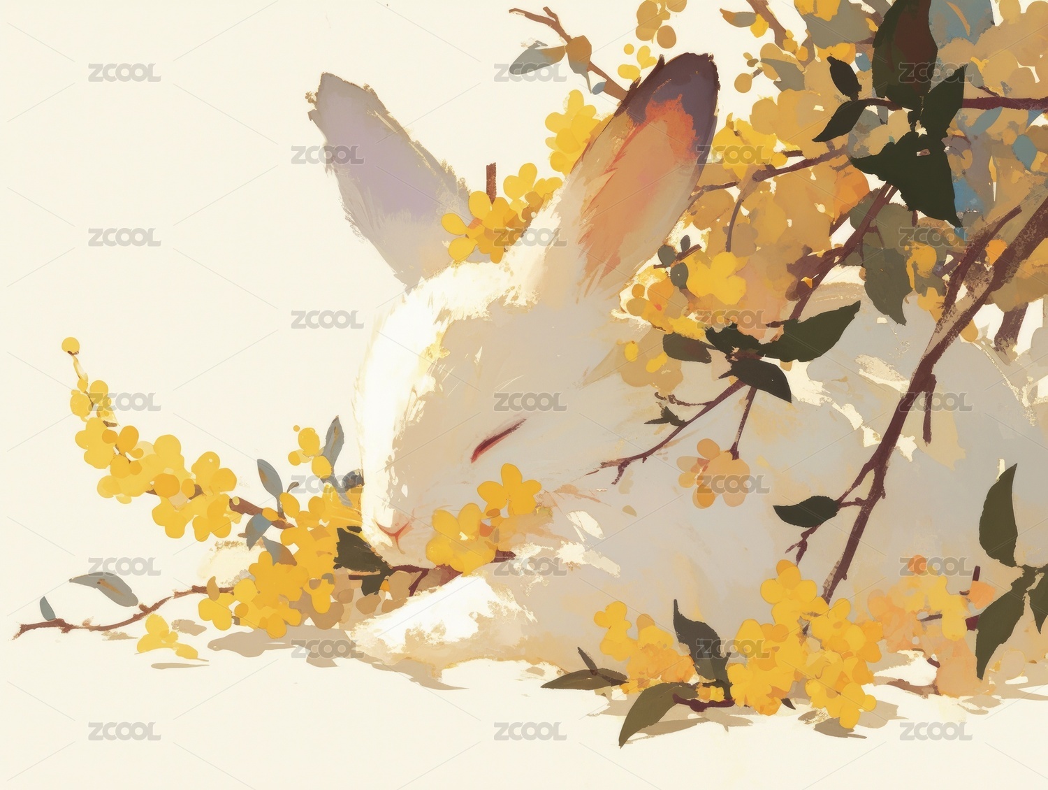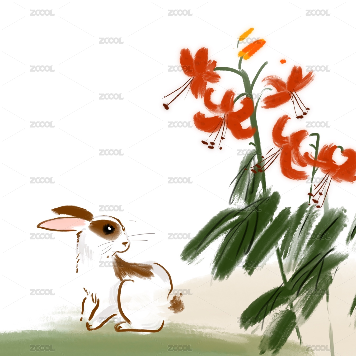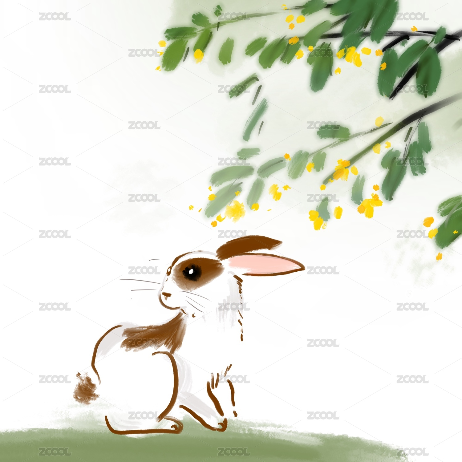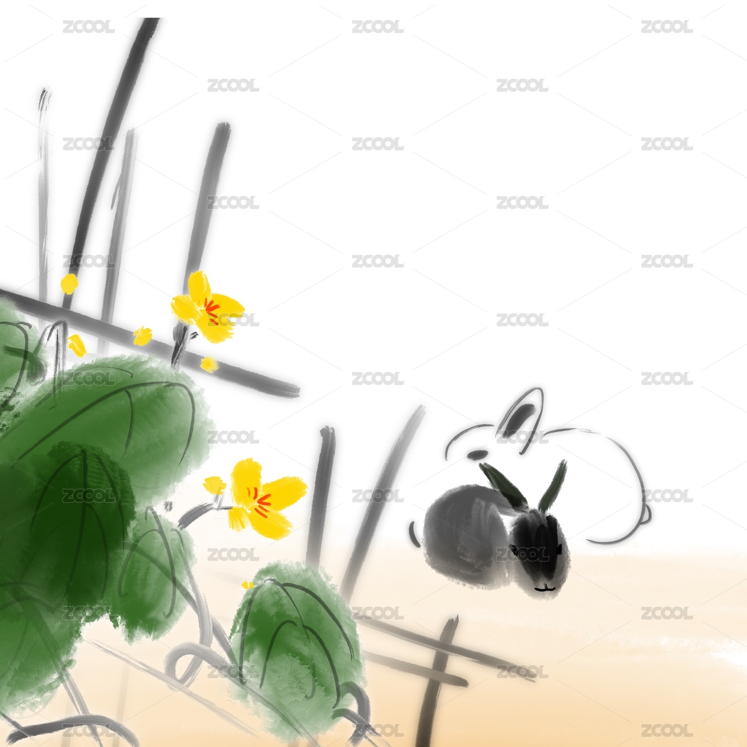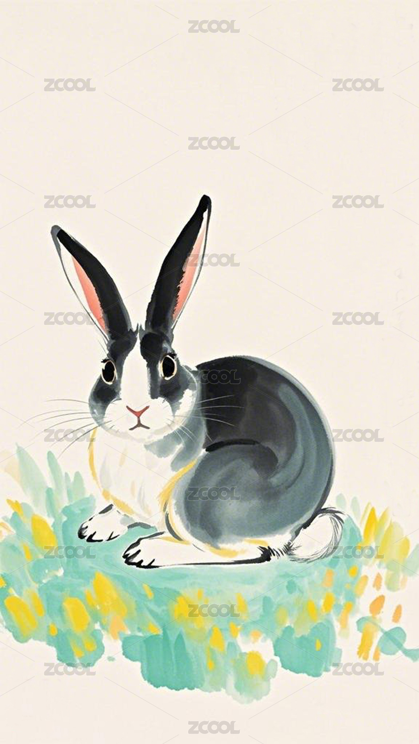 水墨简笔花可爱的兔子