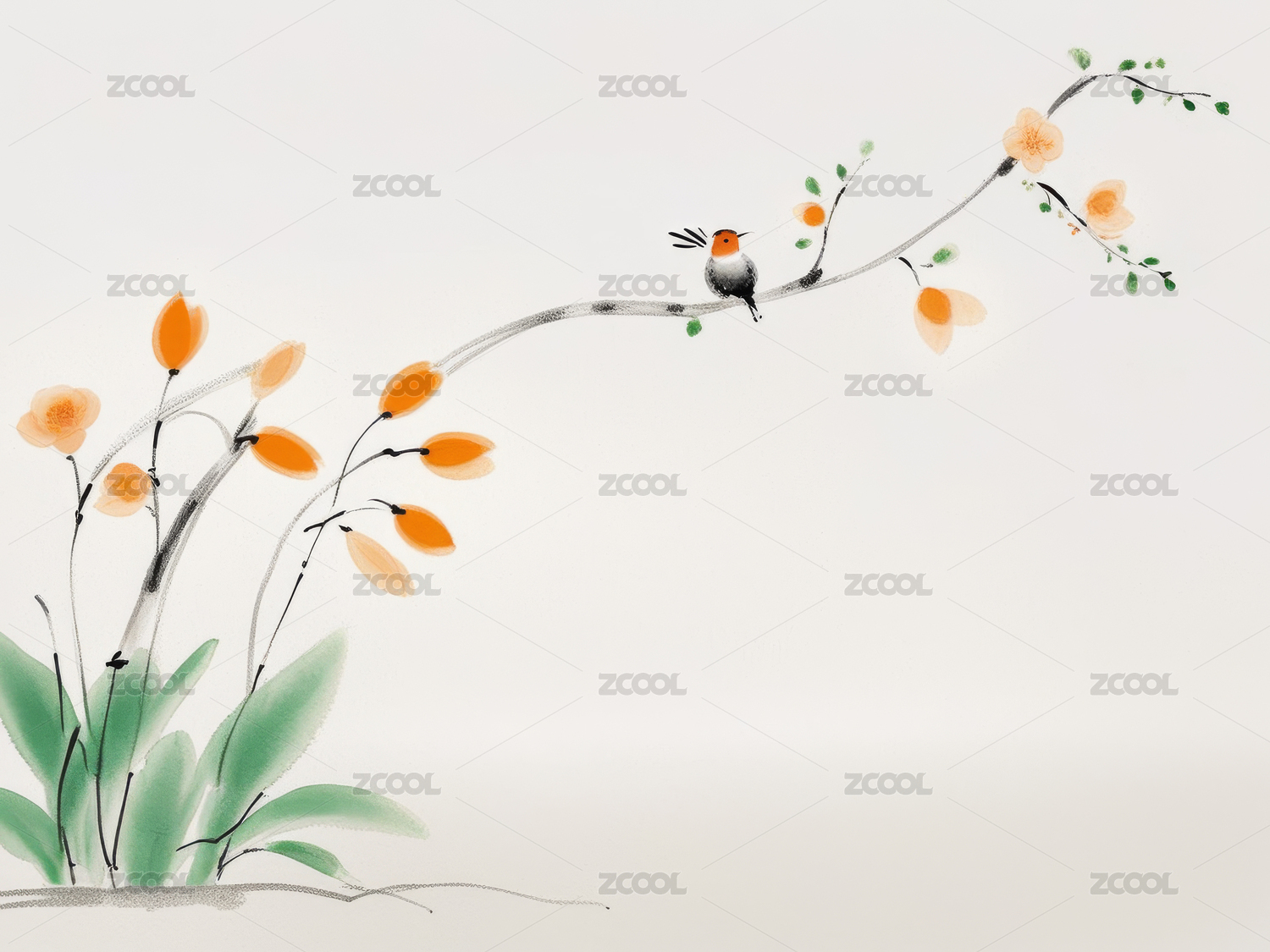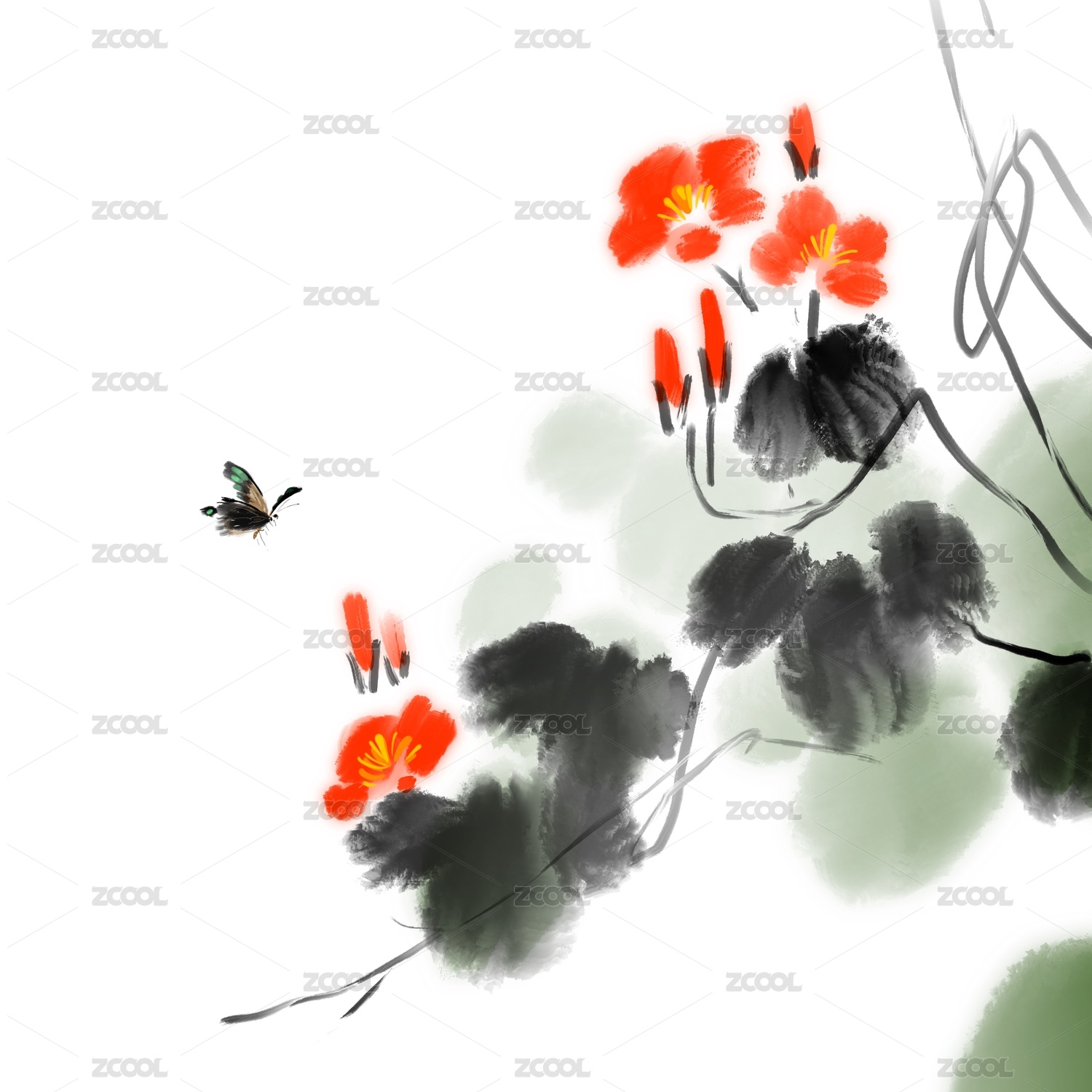中国风水墨写意花卉插画