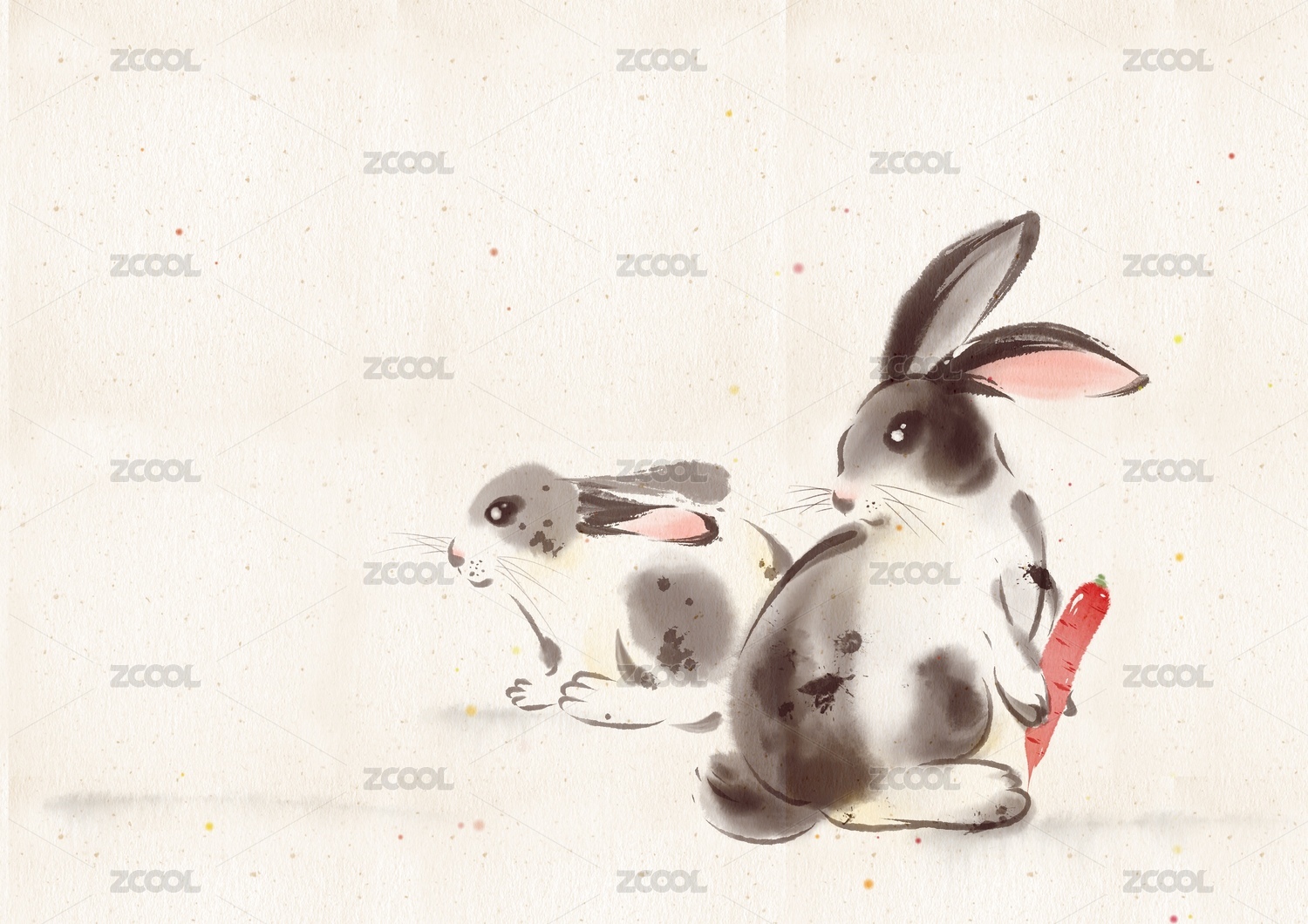 手绘国风水墨动物兔子