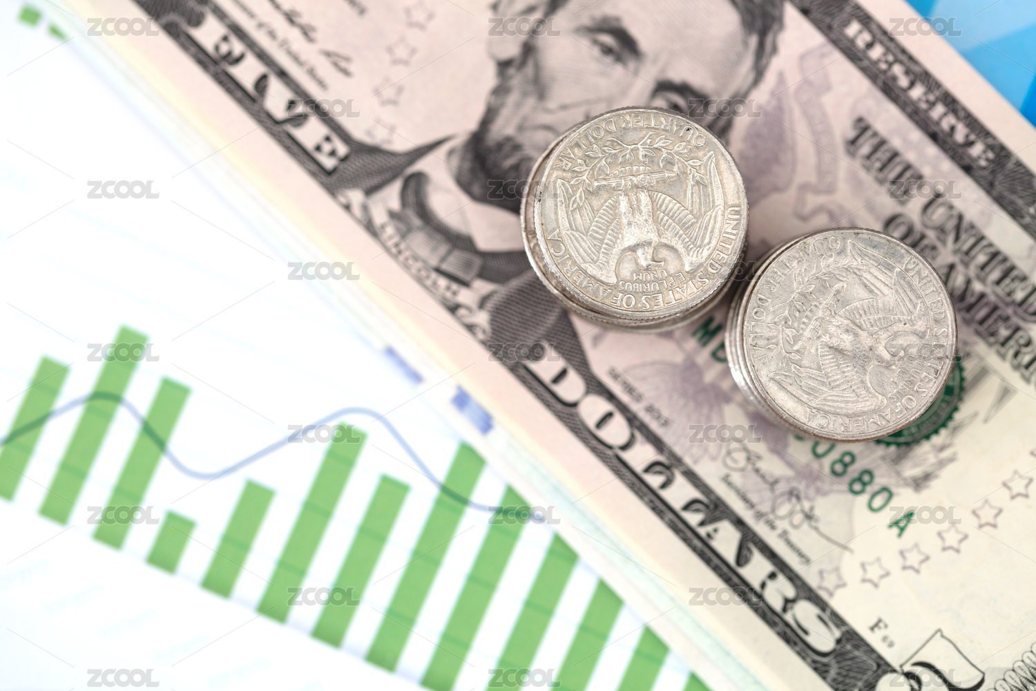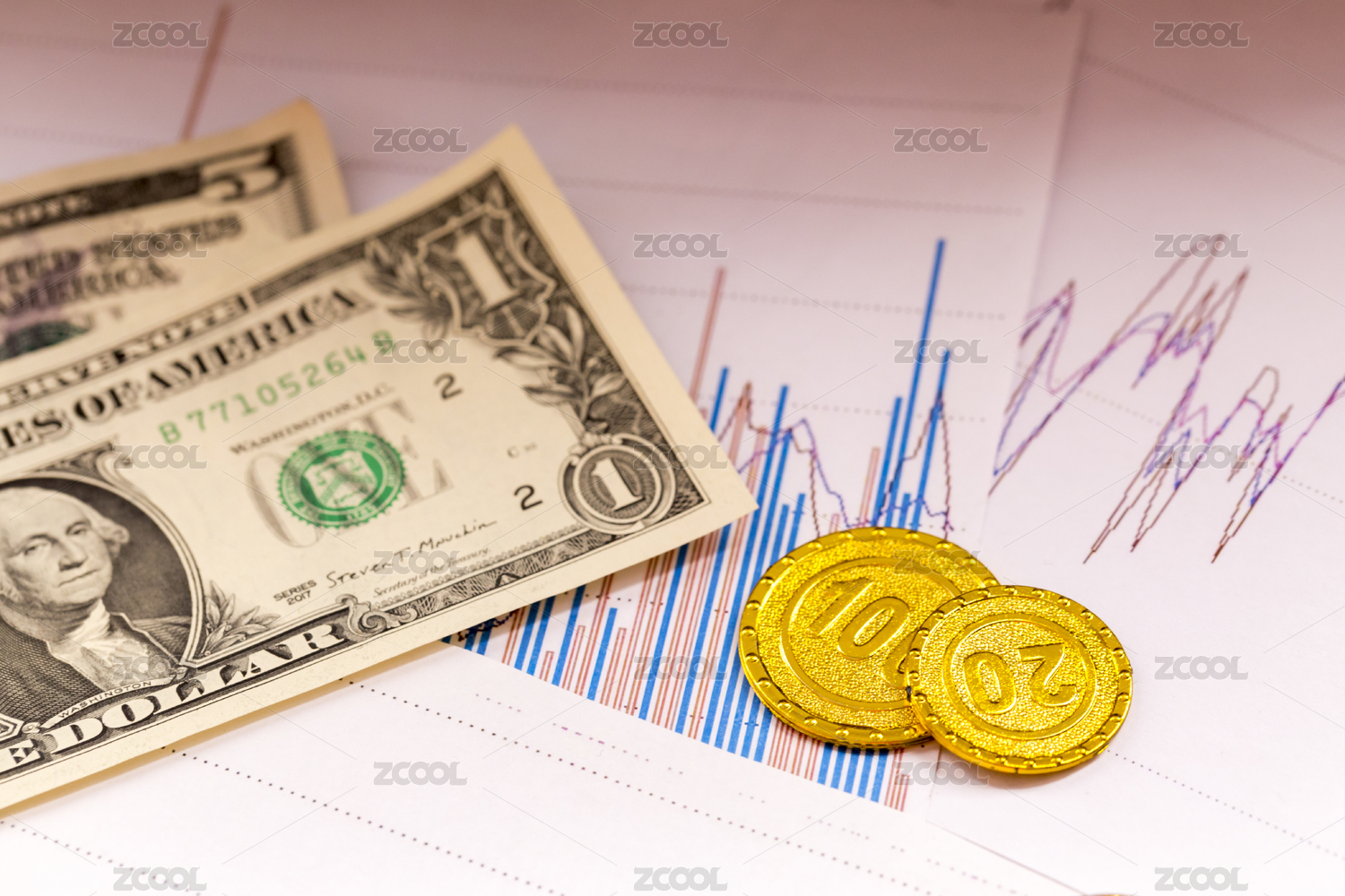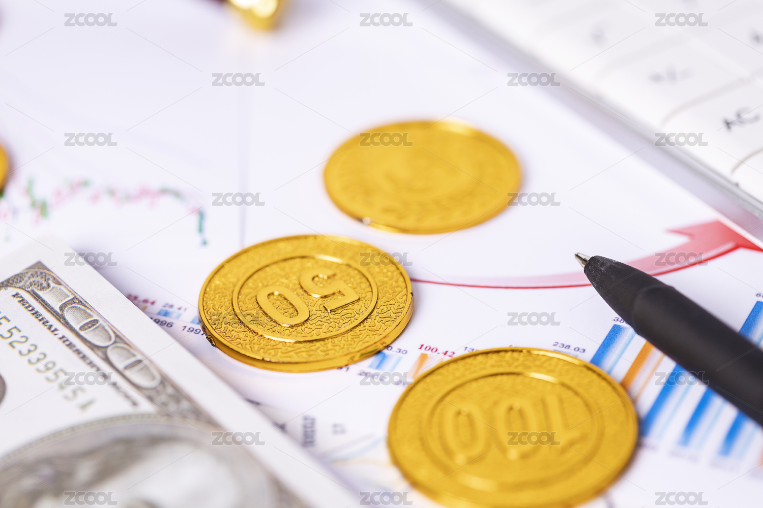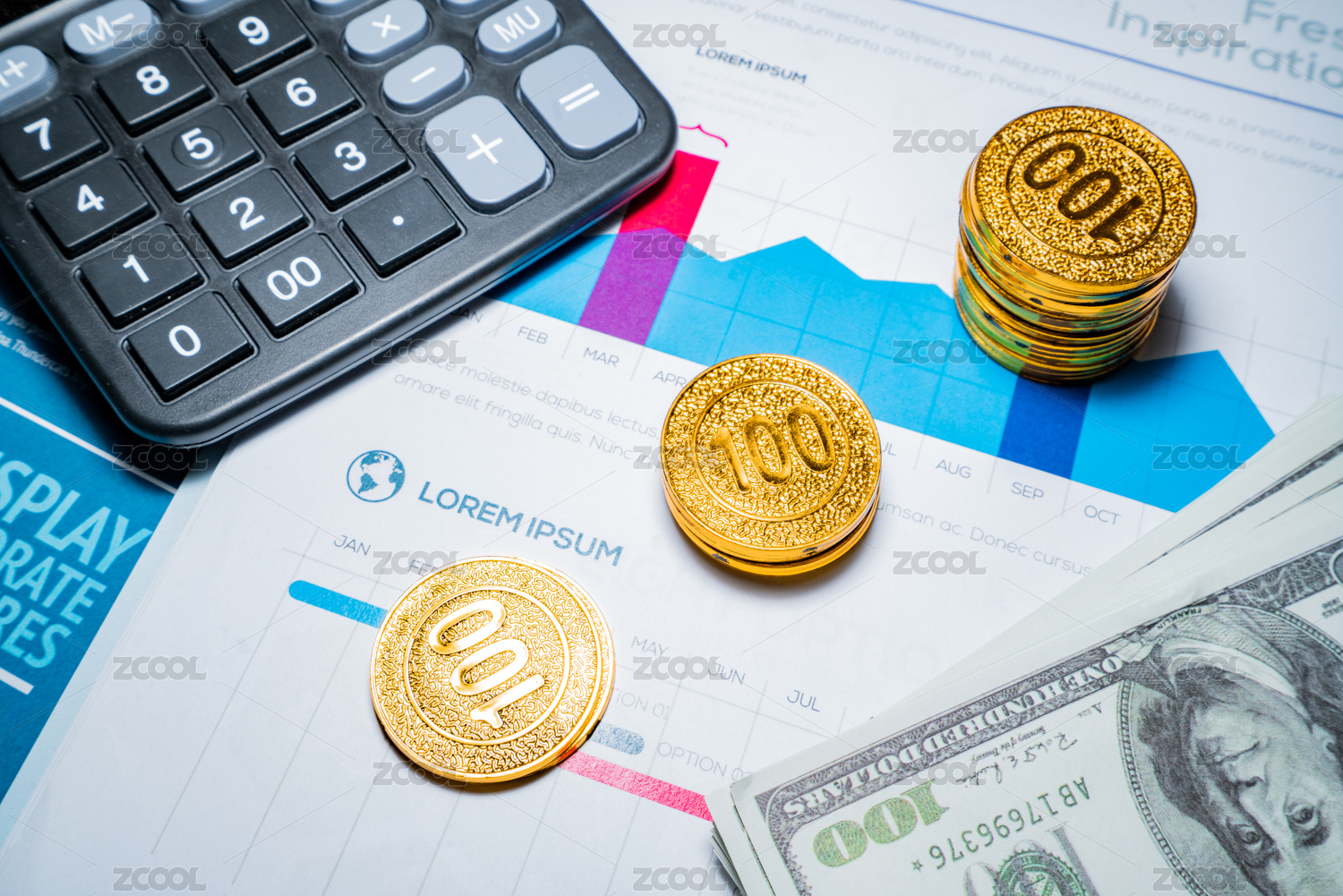 桌面上放着计算器和美美金金币硬币报表图表报告金融经济行情分析概念