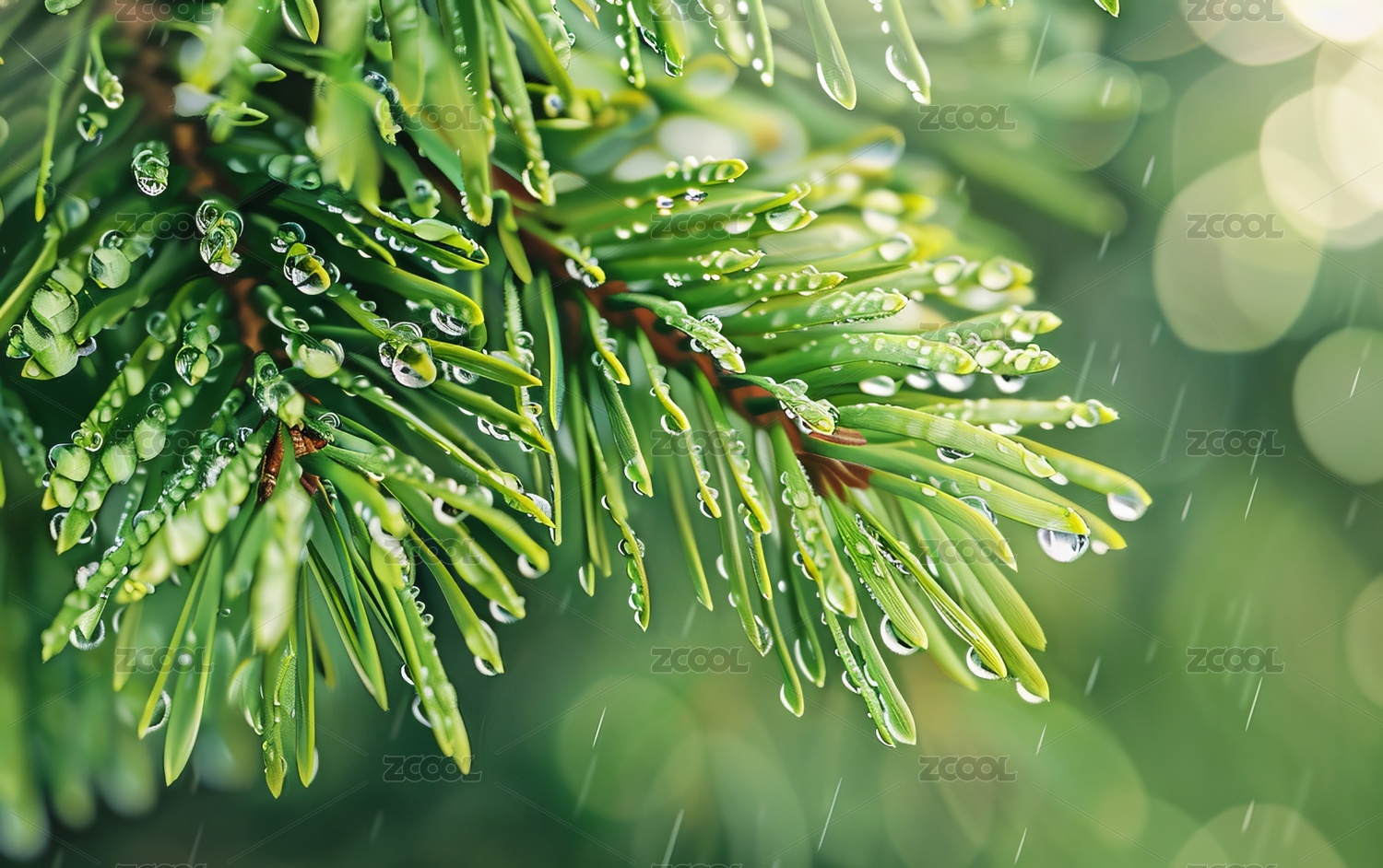 雨中松针带露特写