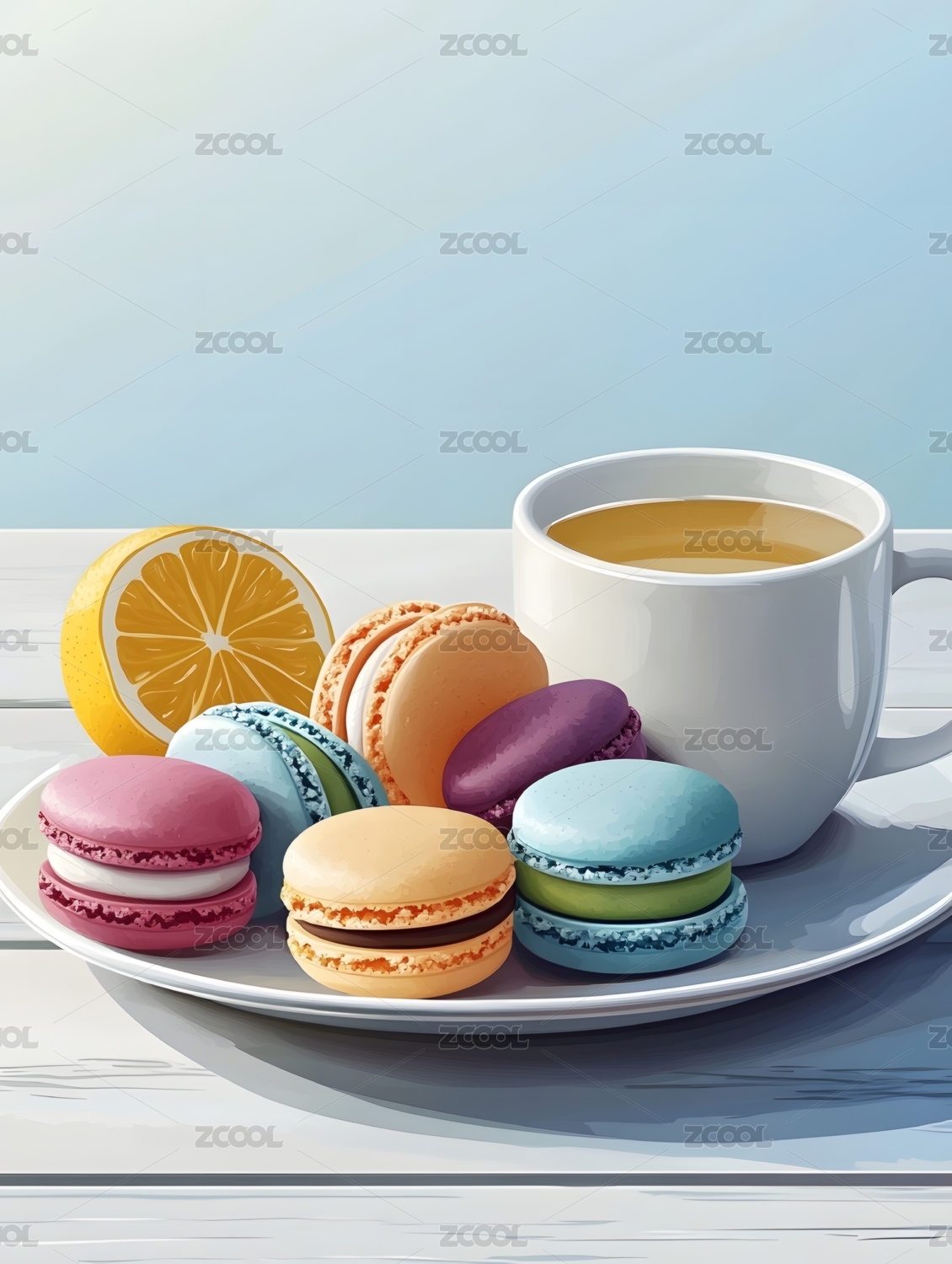 法国五颜六色的马卡龙堆在咖啡杯上白色背景