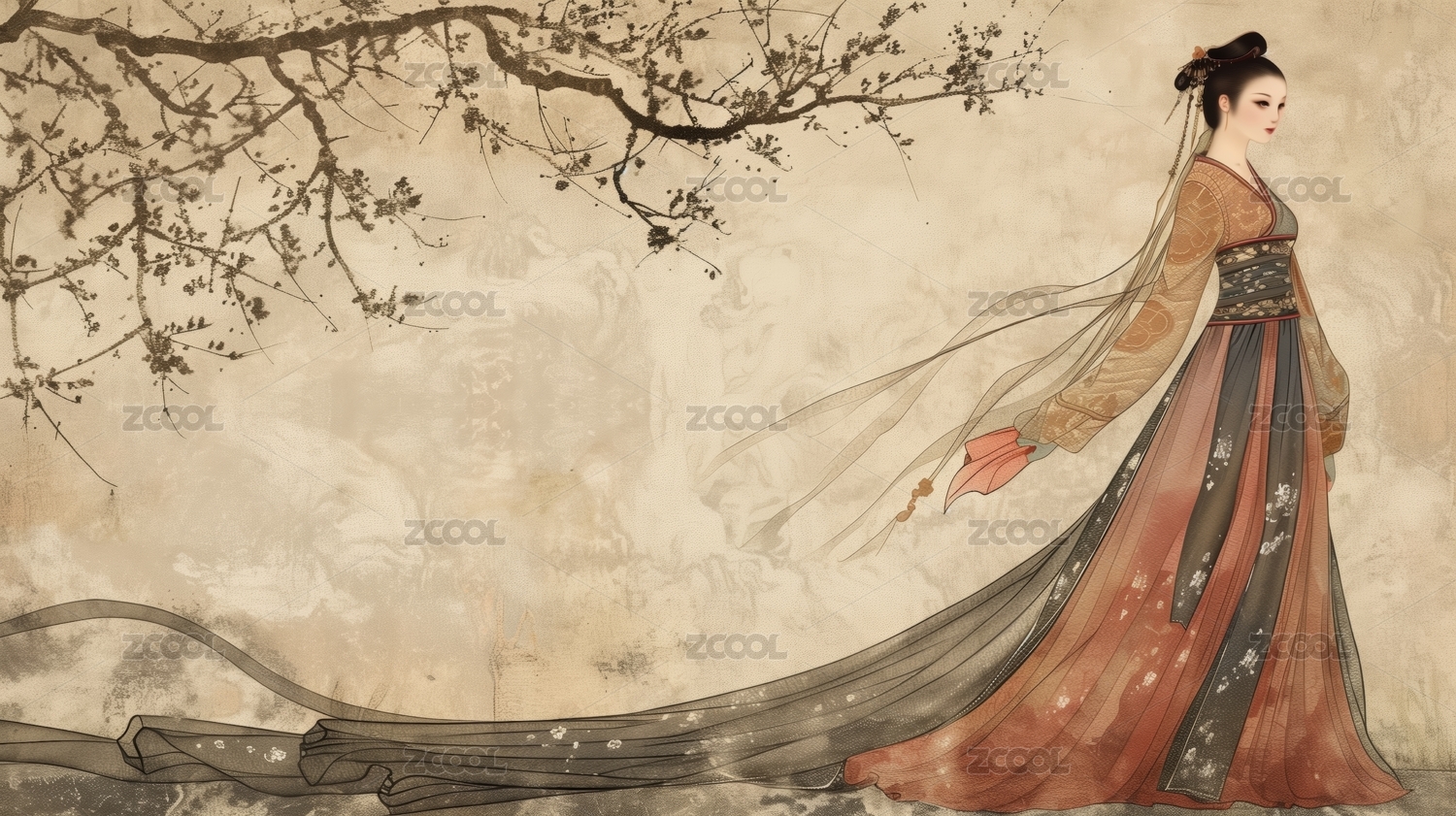 古风汉服吹笛子女孩坐在树木梅花喜鹊飘带