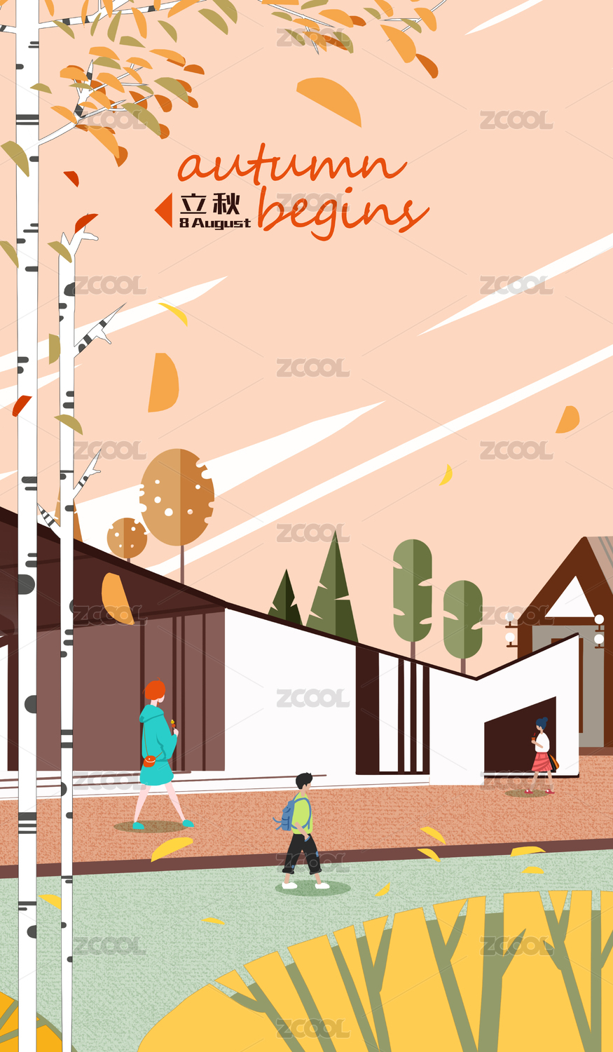 落叶的城市街上逛街购物的行人 立秋插画