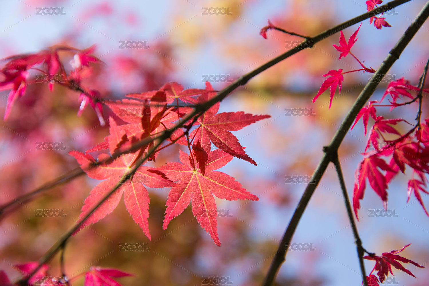 阳光红枫叶蓝天背景