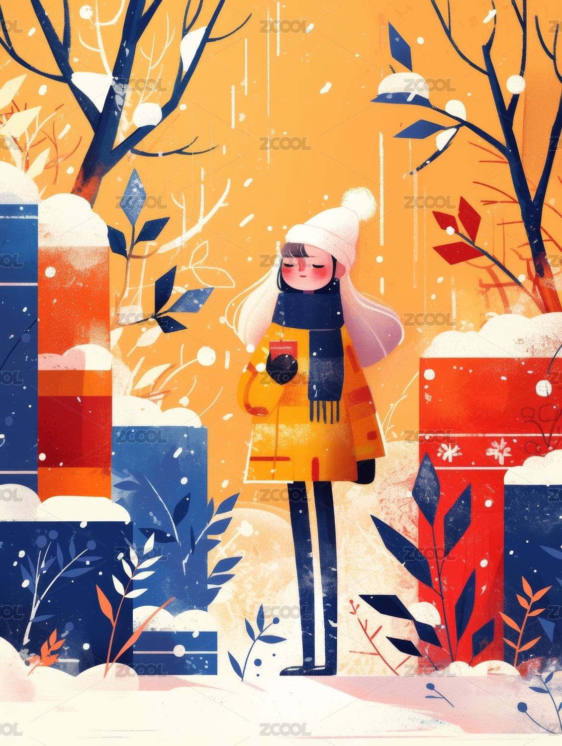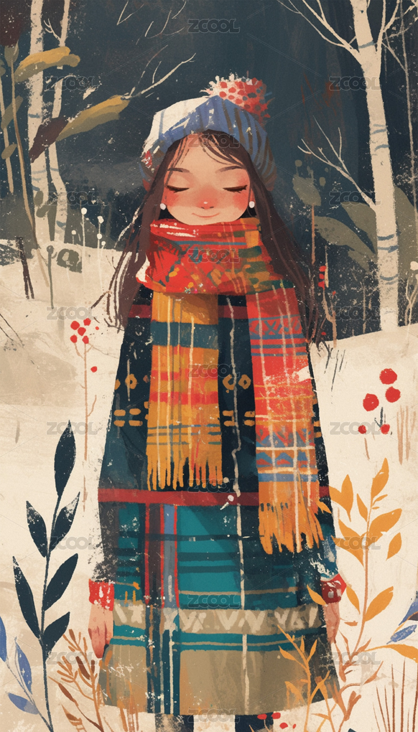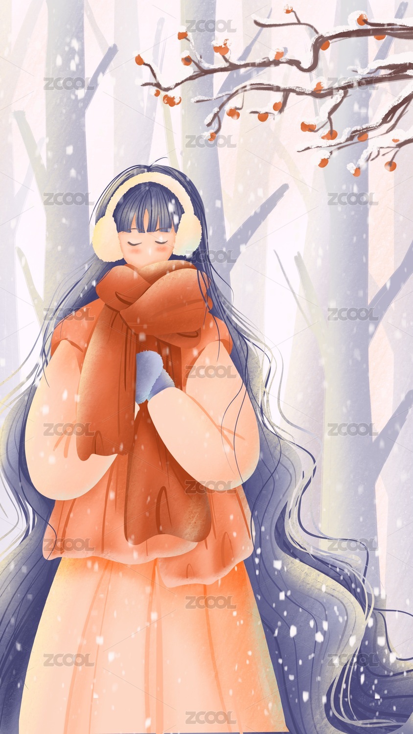 女孩,插画,过年,春节,新春,雪,大雪,温暖,保暖,过节