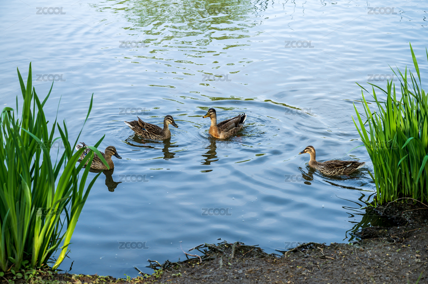 白天鹅和野鸭子灰雁在公园湖水中游动