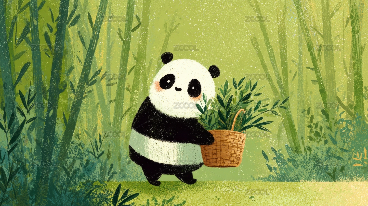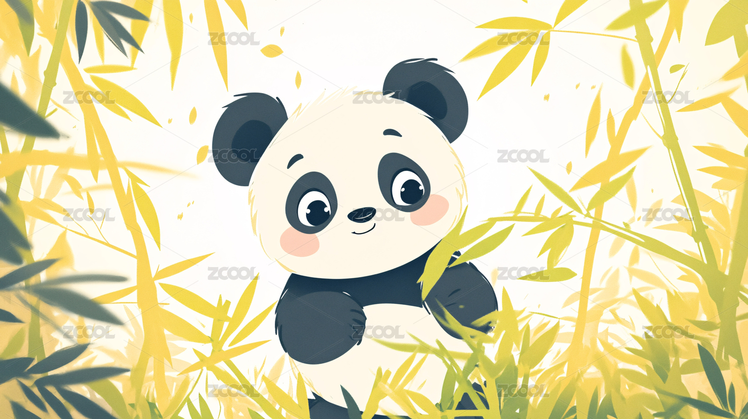 可爱熊猫与小鸟静坐枝头 绿色森林氛围