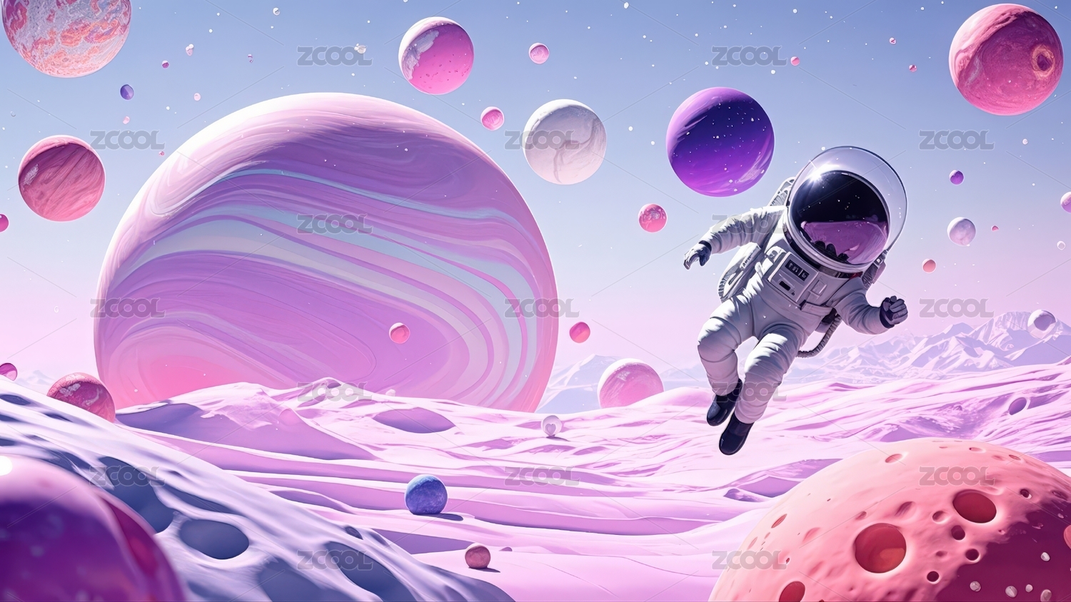 星空宇航员漂浮于紫粉色宇宙,奇幻而神秘