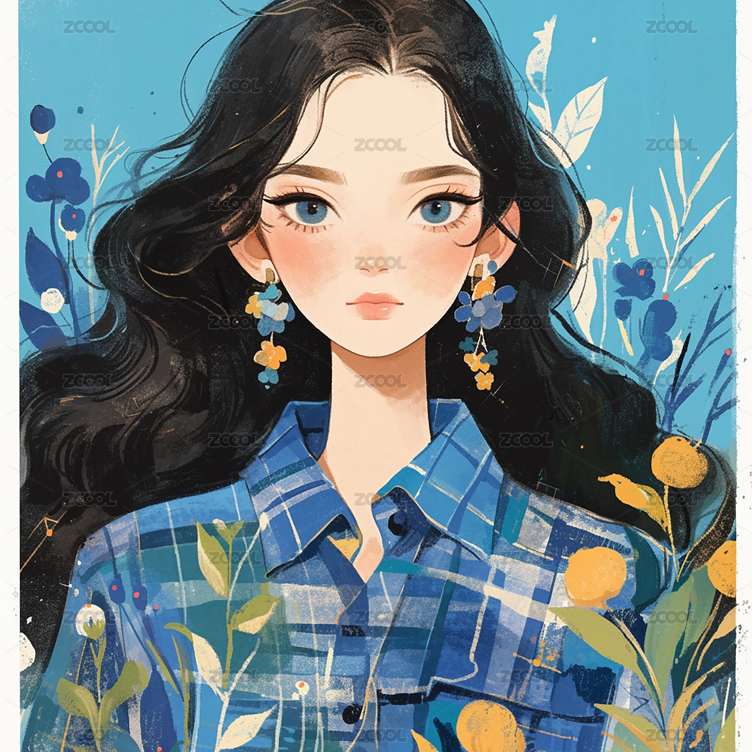 格子连衣裙金耳环长发女子