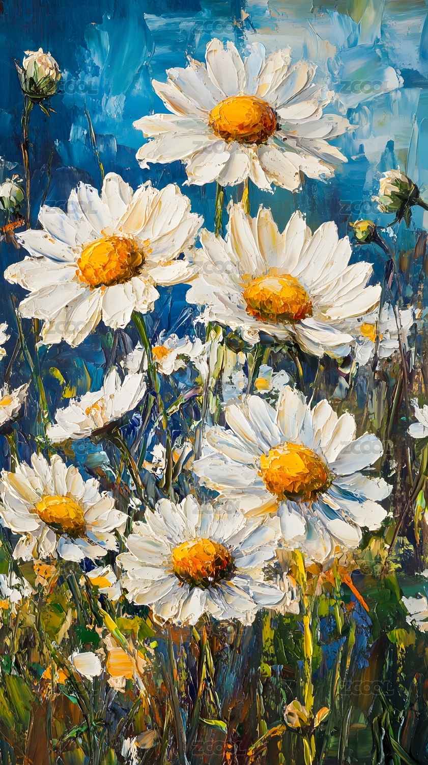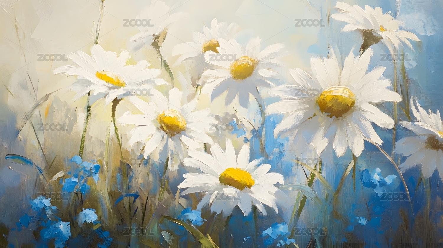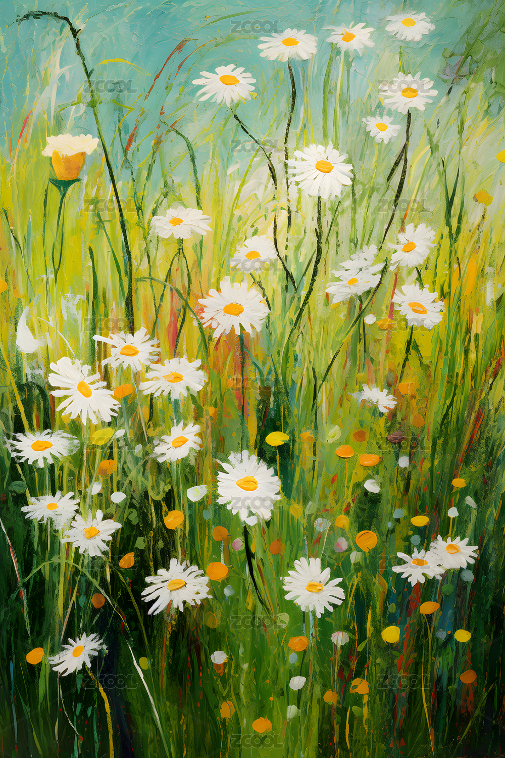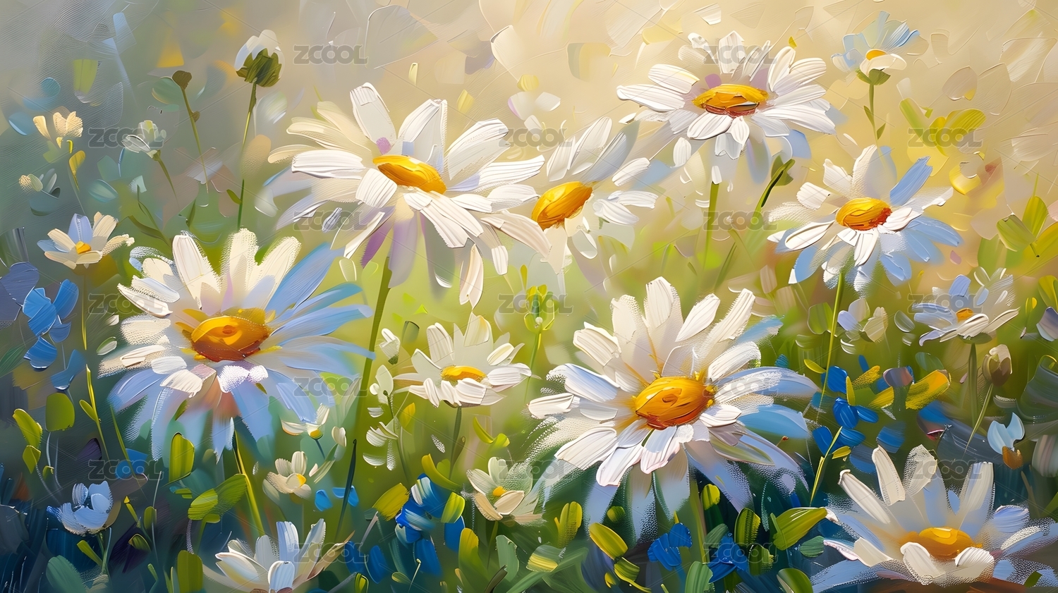 绘画,油画,雏菊,花田,鲜花,花朵,自然,风景,春天,夏天
