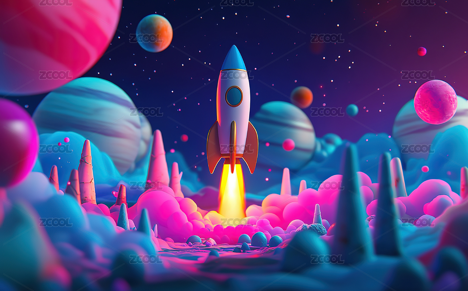 三维,3D,插画,星球,梦幻,山,白云,地球,火箭,中国航天日