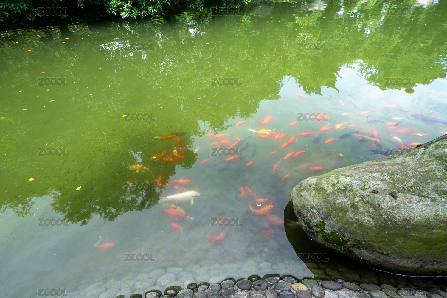 木渎古镇严家花园池塘里的锦鲤鱼群