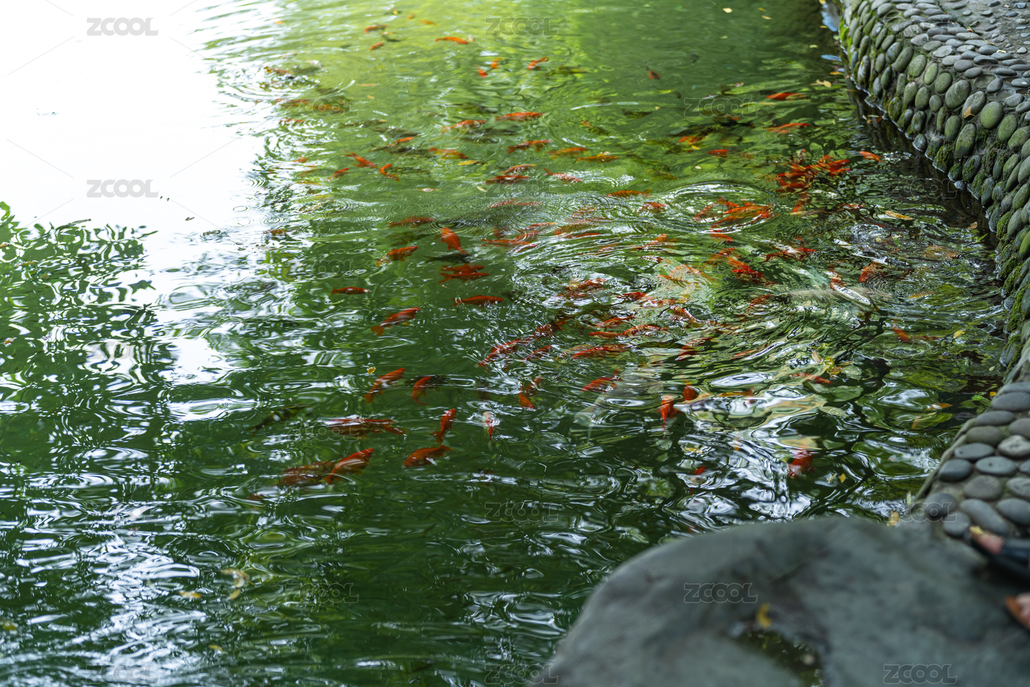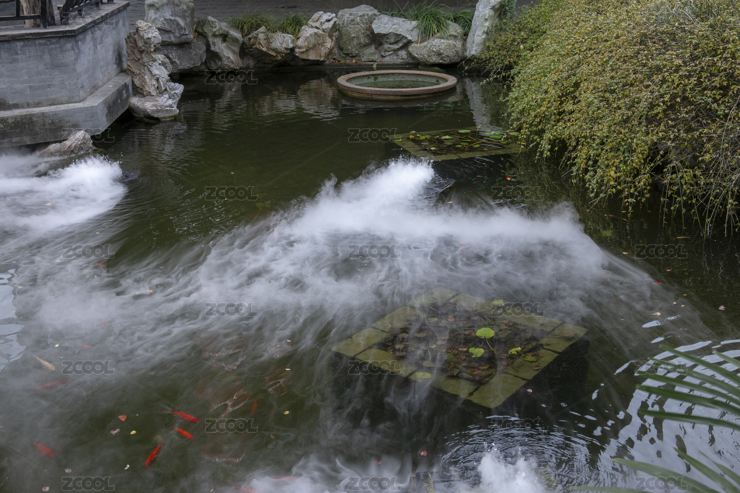 中国江苏苏州园林阴雨天池塘里游动的鱼儿
