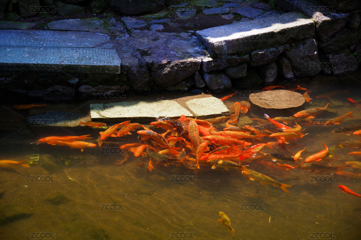中国浙江绍兴兰亭景区王右军祠池塘中的金鱼