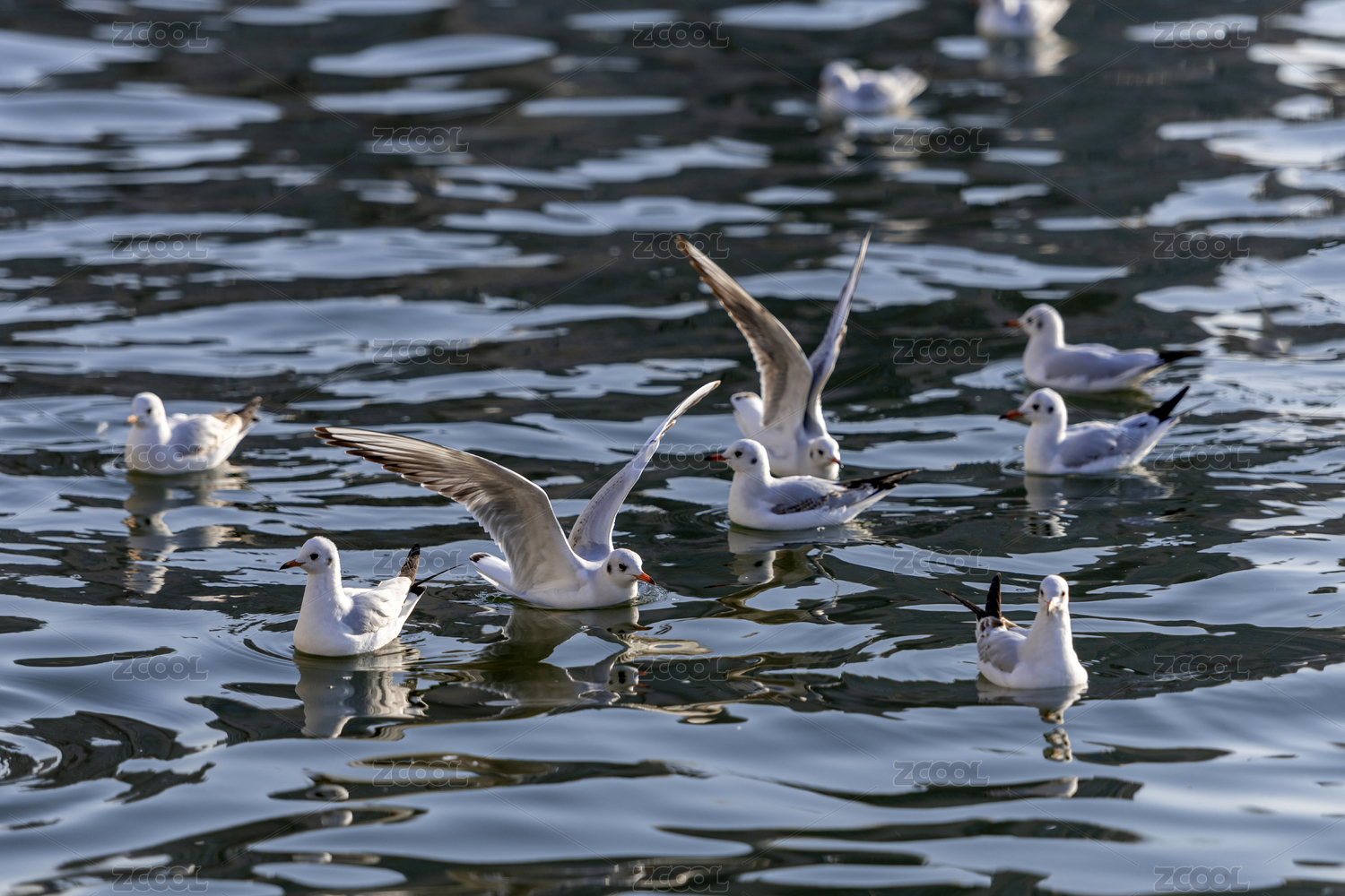 红嘴海鸥在水面上自由飞翔追逐觅食嬉戏