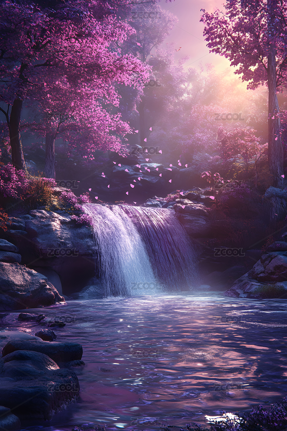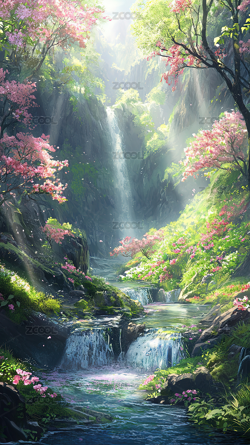 梦幻樱花瀑布仙境风景图