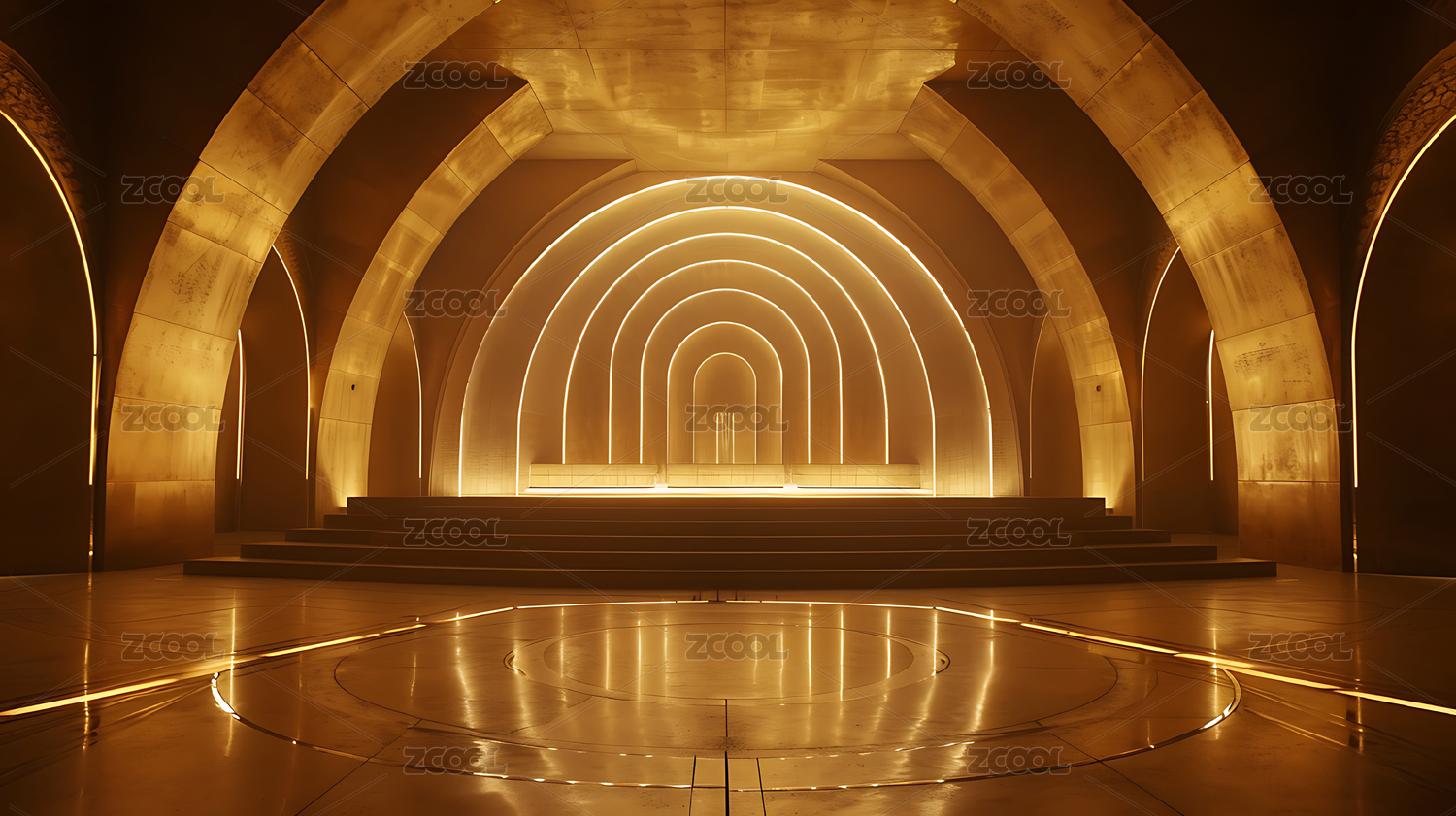 高分辨率,超现实主义,建筑渲染,温暖色调,细致纹理,圆形舞台,椭圆形楼梯,LED灯光,木质墙面,现代室内设计