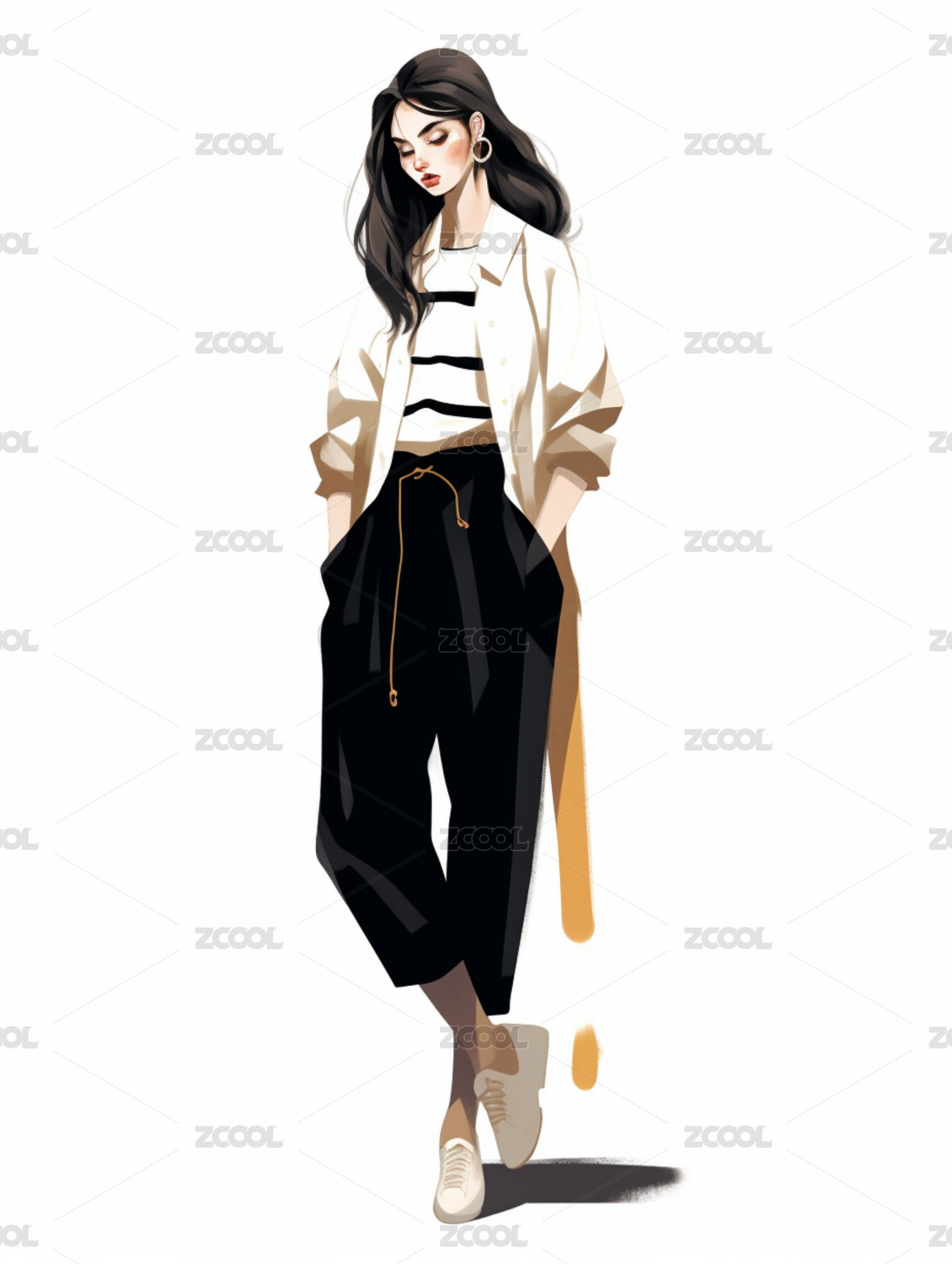 一个黄色头发穿黑色短裙花色衬衫的女孩正在街拍,夏日街拍插画