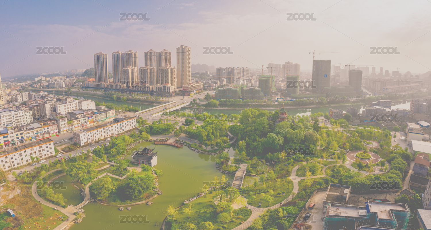 日出时分,诸暨城市风光航拍,诸暨城市广场