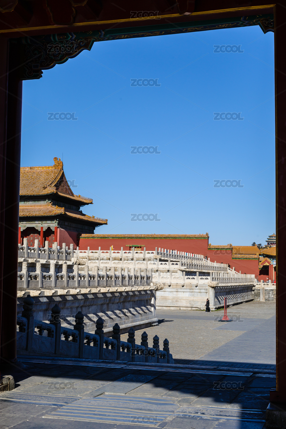 晴朗的蓝天下中国北京故宫博物院太和广场宫殿走道
