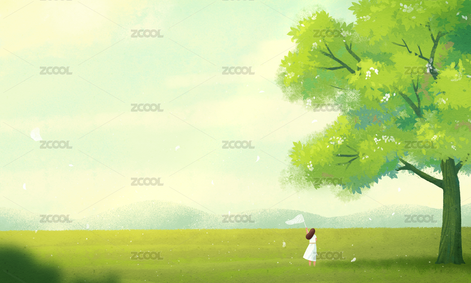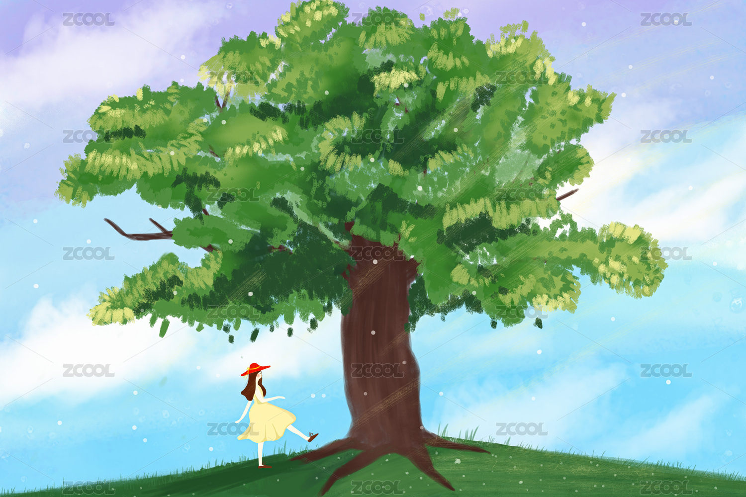 清新,文艺,插画,树,树干,女孩,少女,温馨,浪漫,幻想