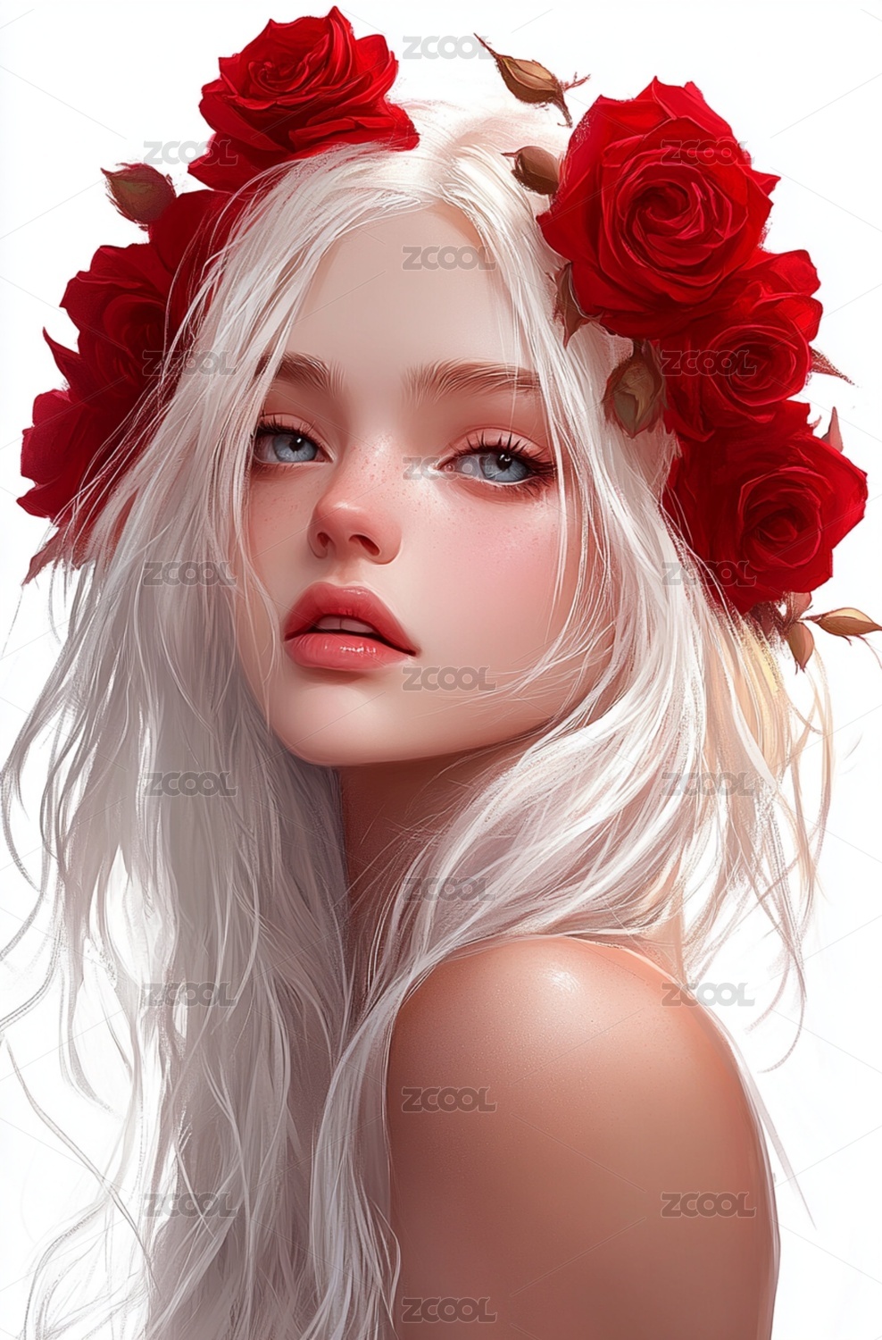 白发红玫瑰女孩浪漫唯美动漫海报油画壁纸