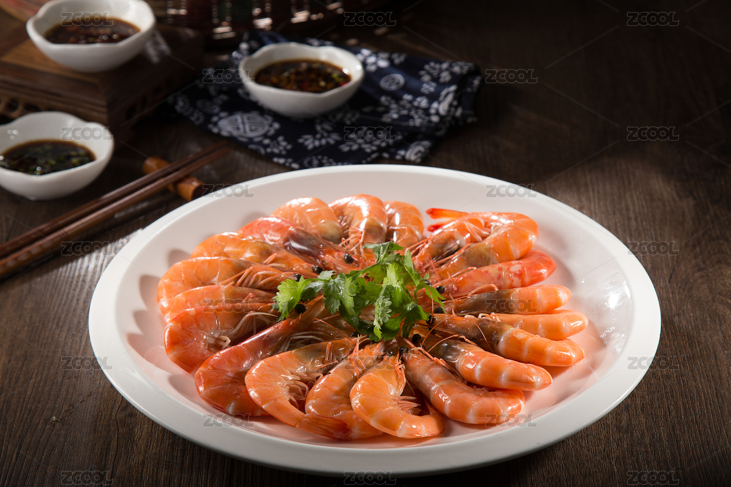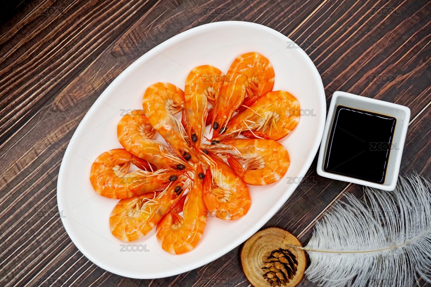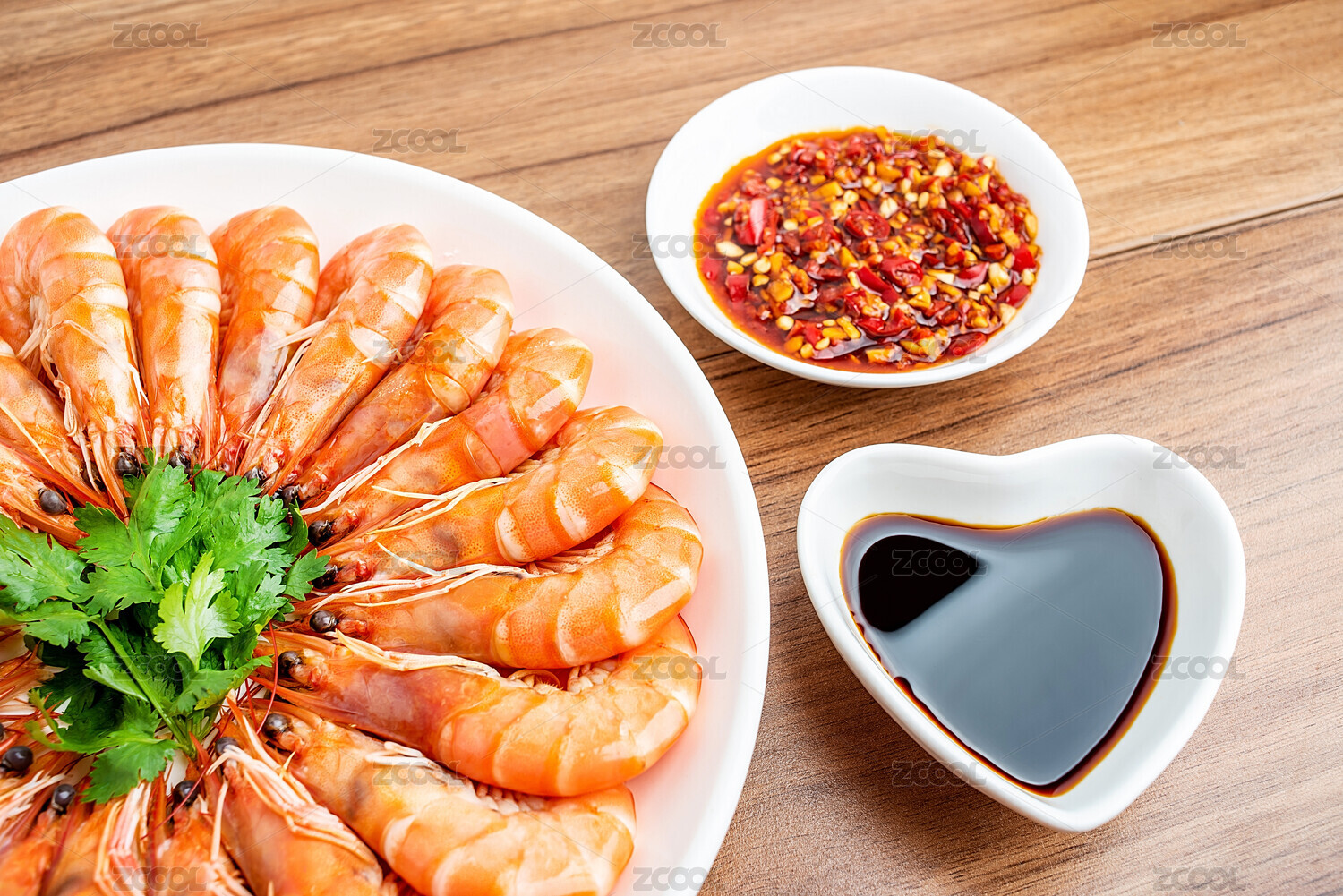 水泥底纹上一碟白灼黑虎虾和调味酱