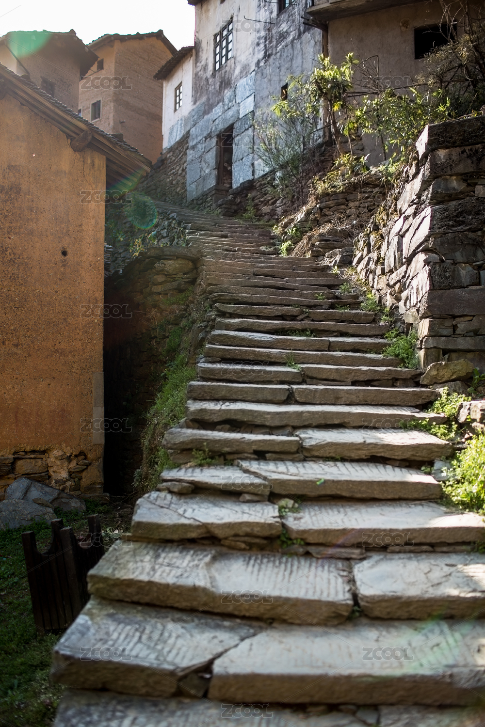 中国古村落里的老旧石板楼梯特写