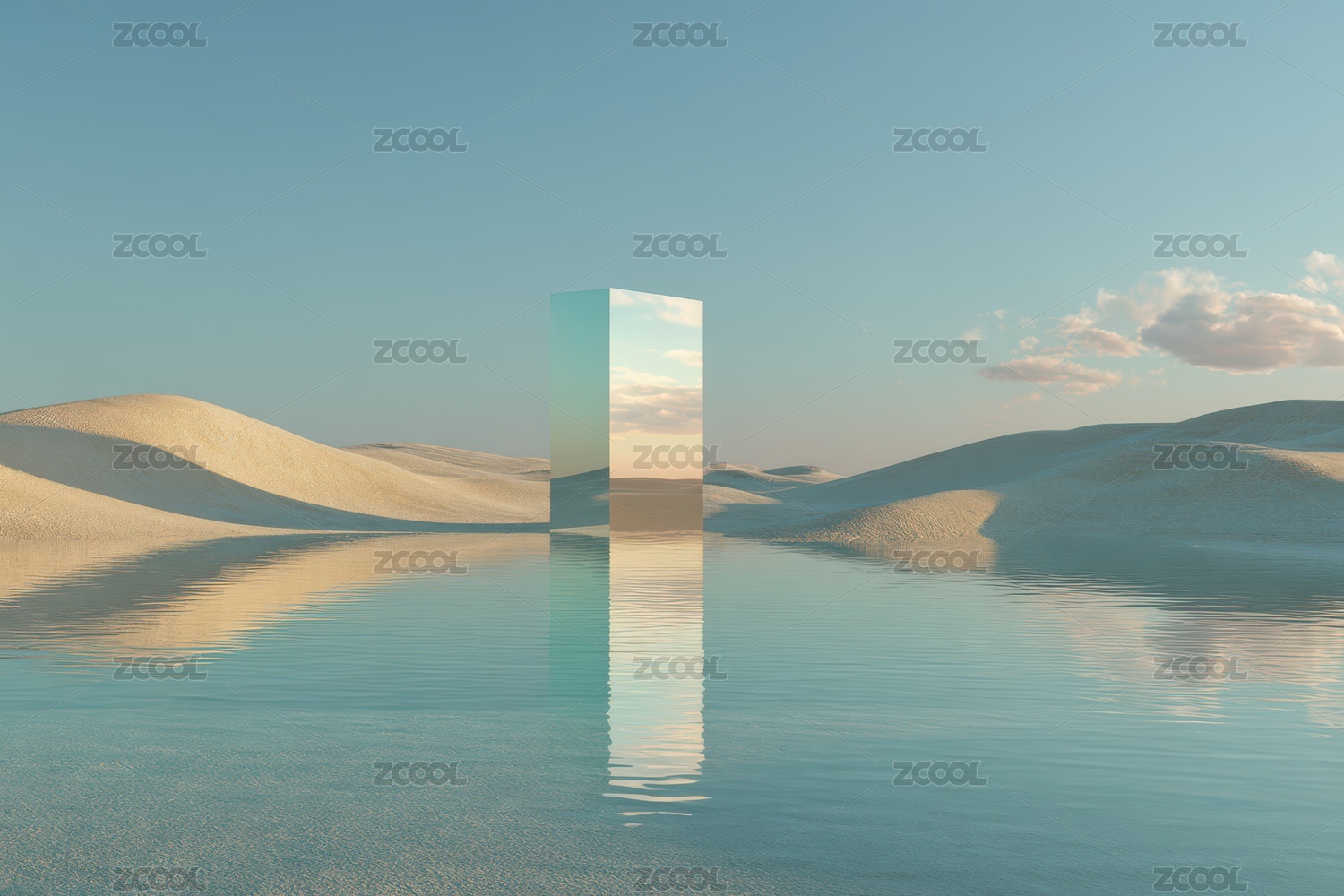 抽象空旷冬天立在雪地冰雕方型镜面3D插画