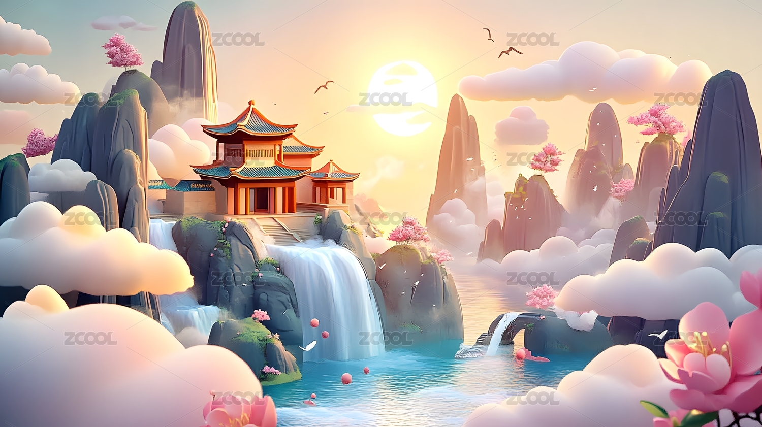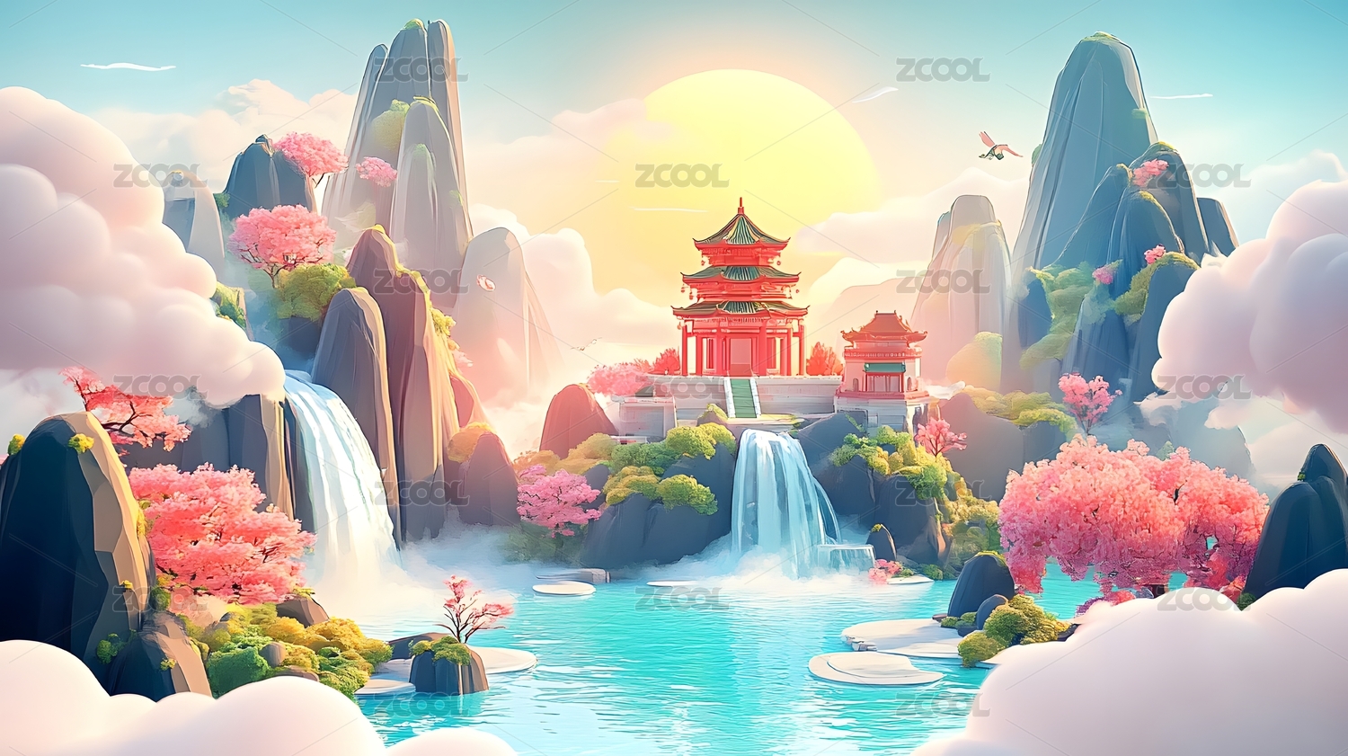 3D国潮山水古建筑自然风景