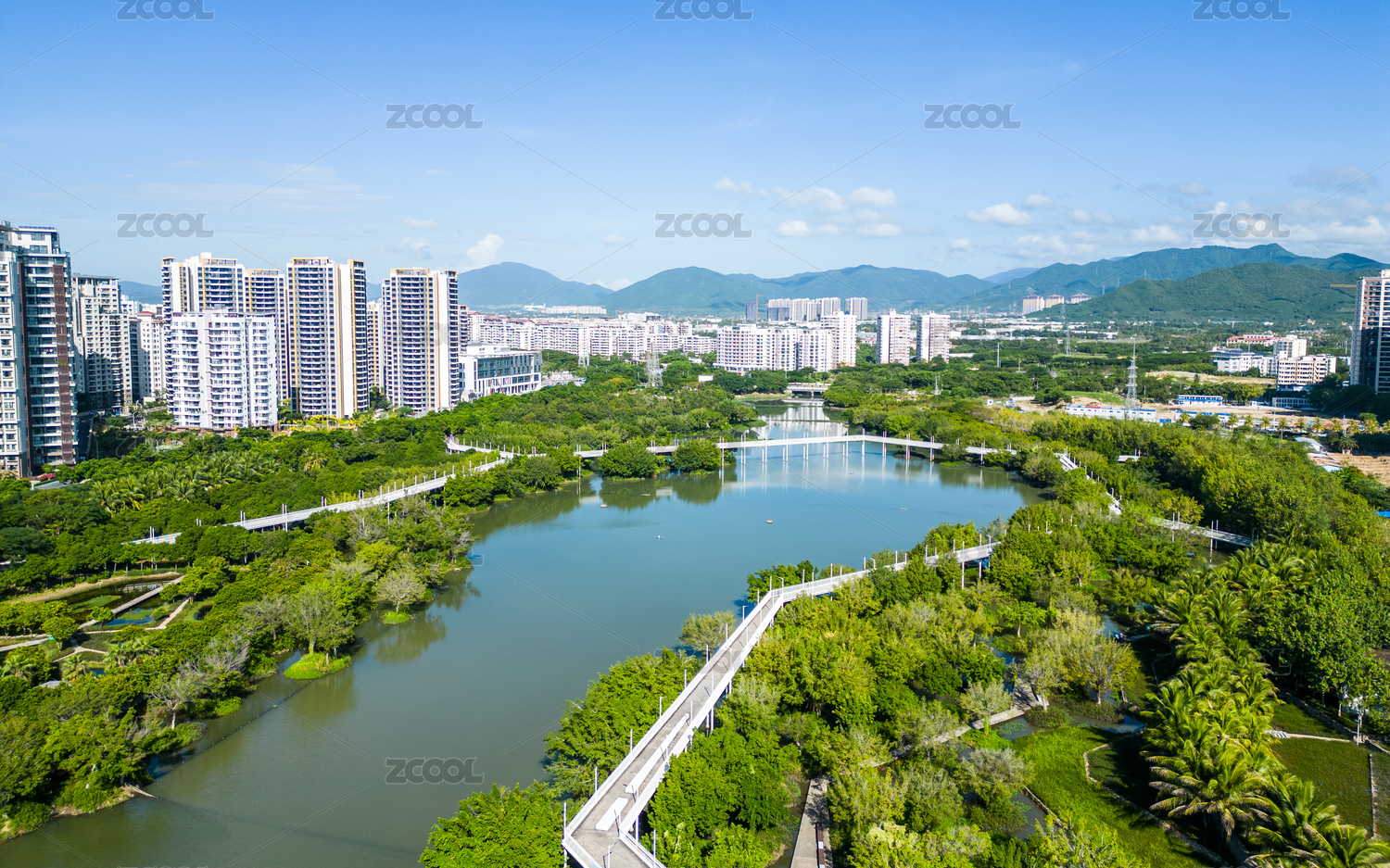 航拍海南三亚红树林公园三亚河城市生态湿地