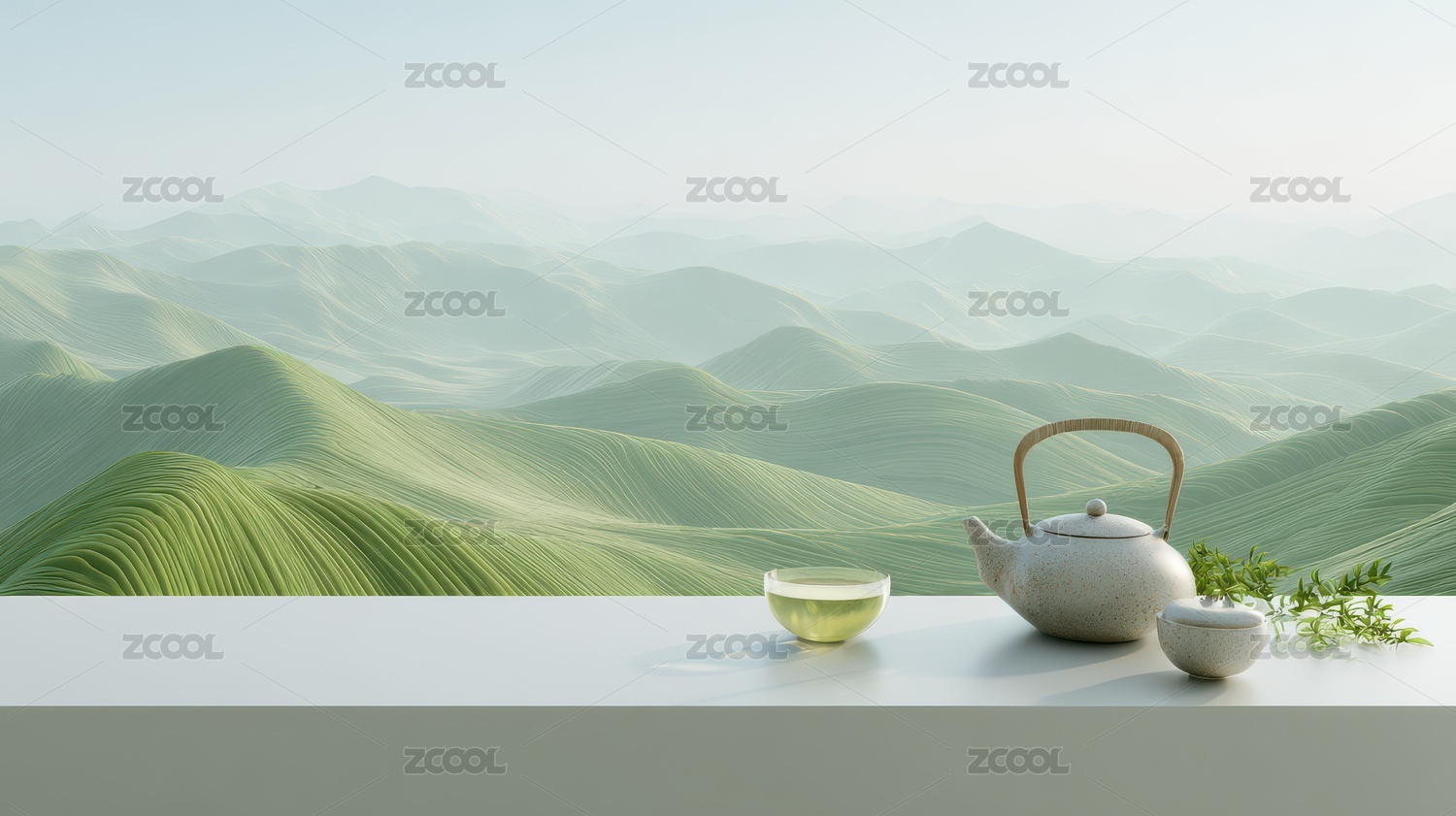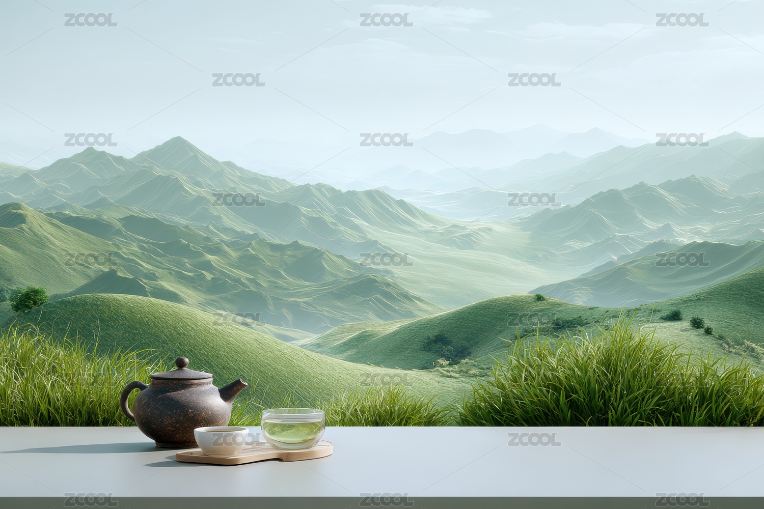 宁静山景与茶具的诗意邂逅
