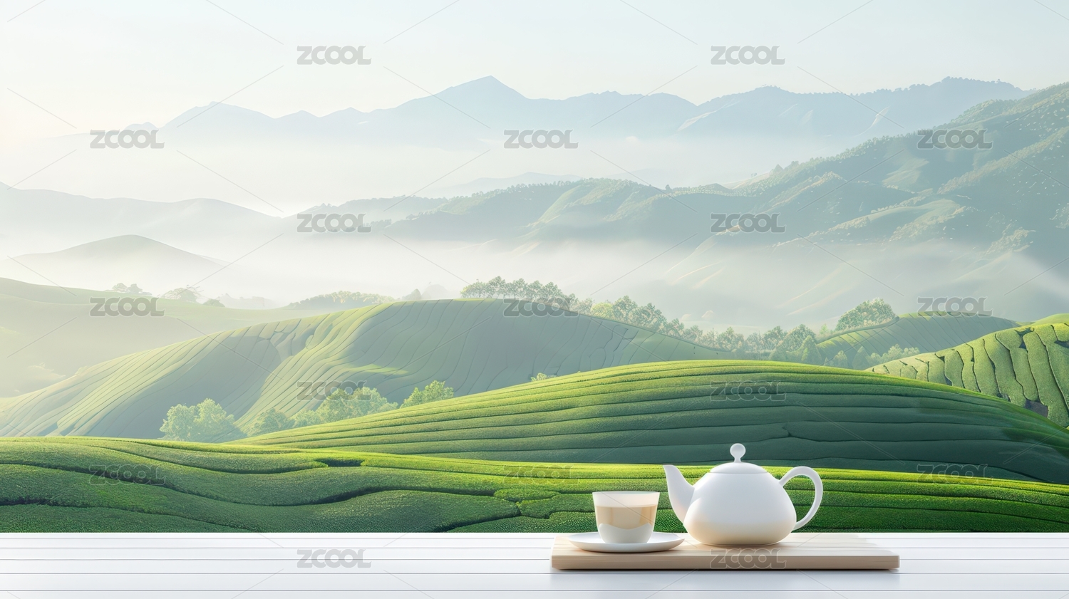 清晨茶园美景与茶具