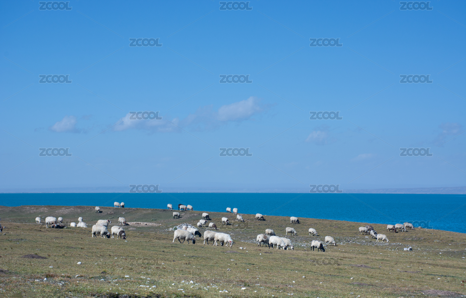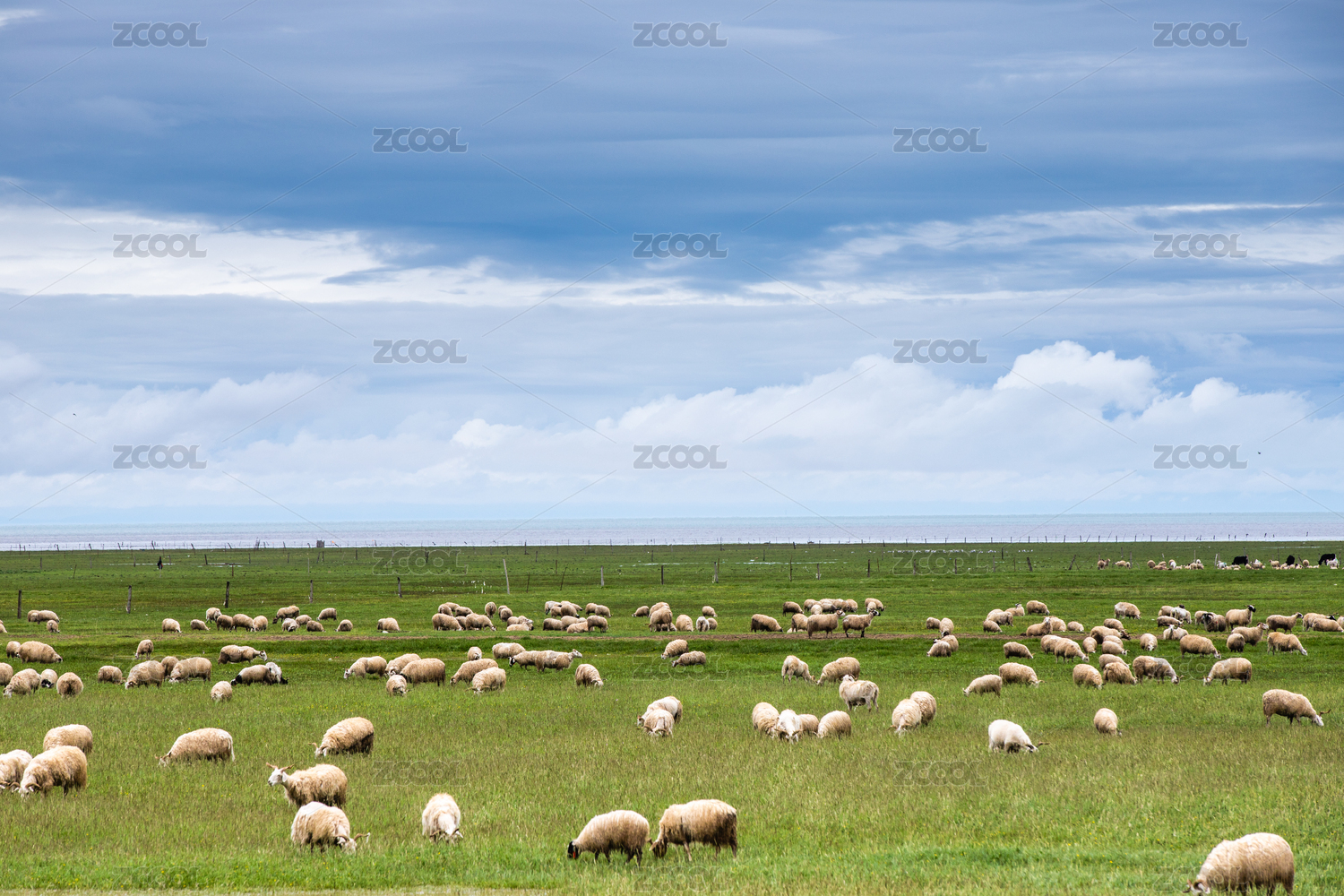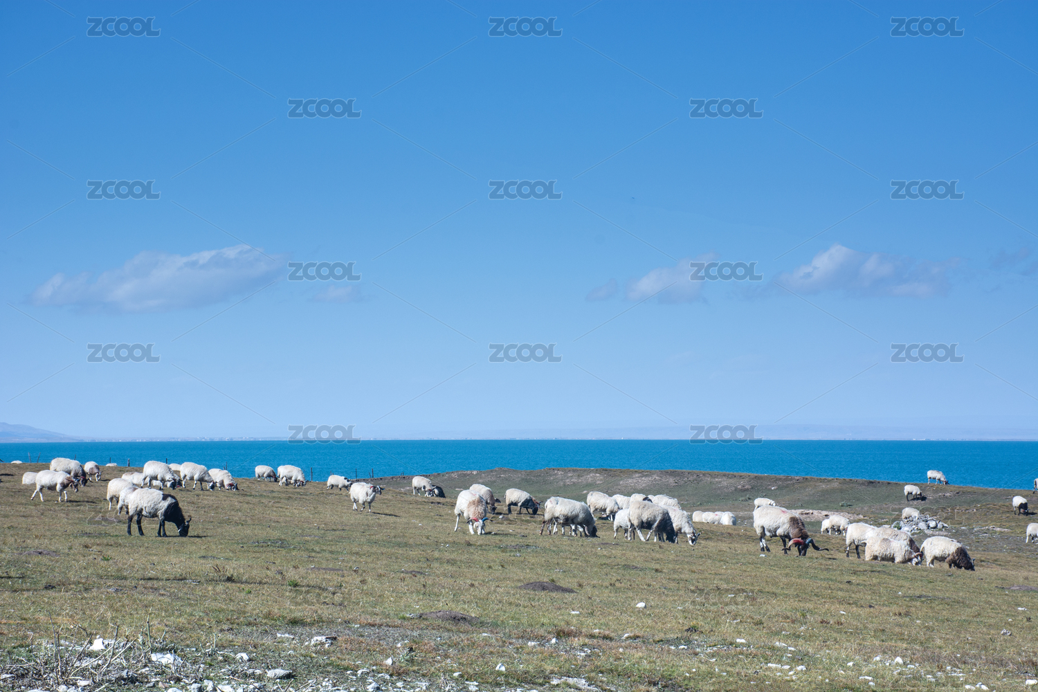中国西部青海湖秋天高原牧场上正在吃草绵羊