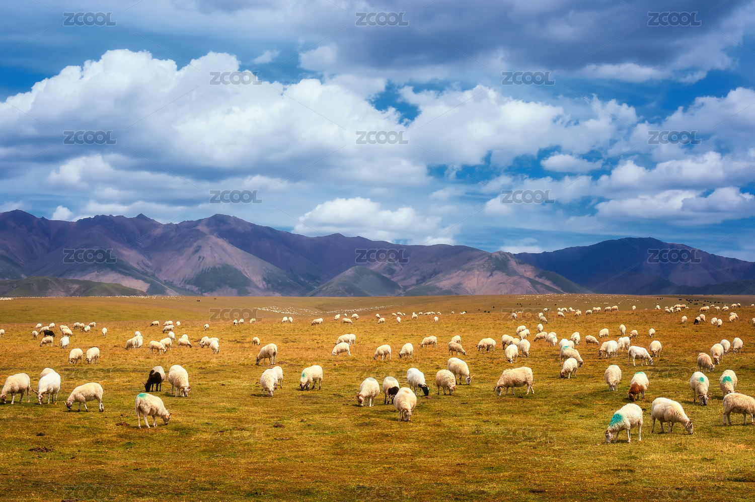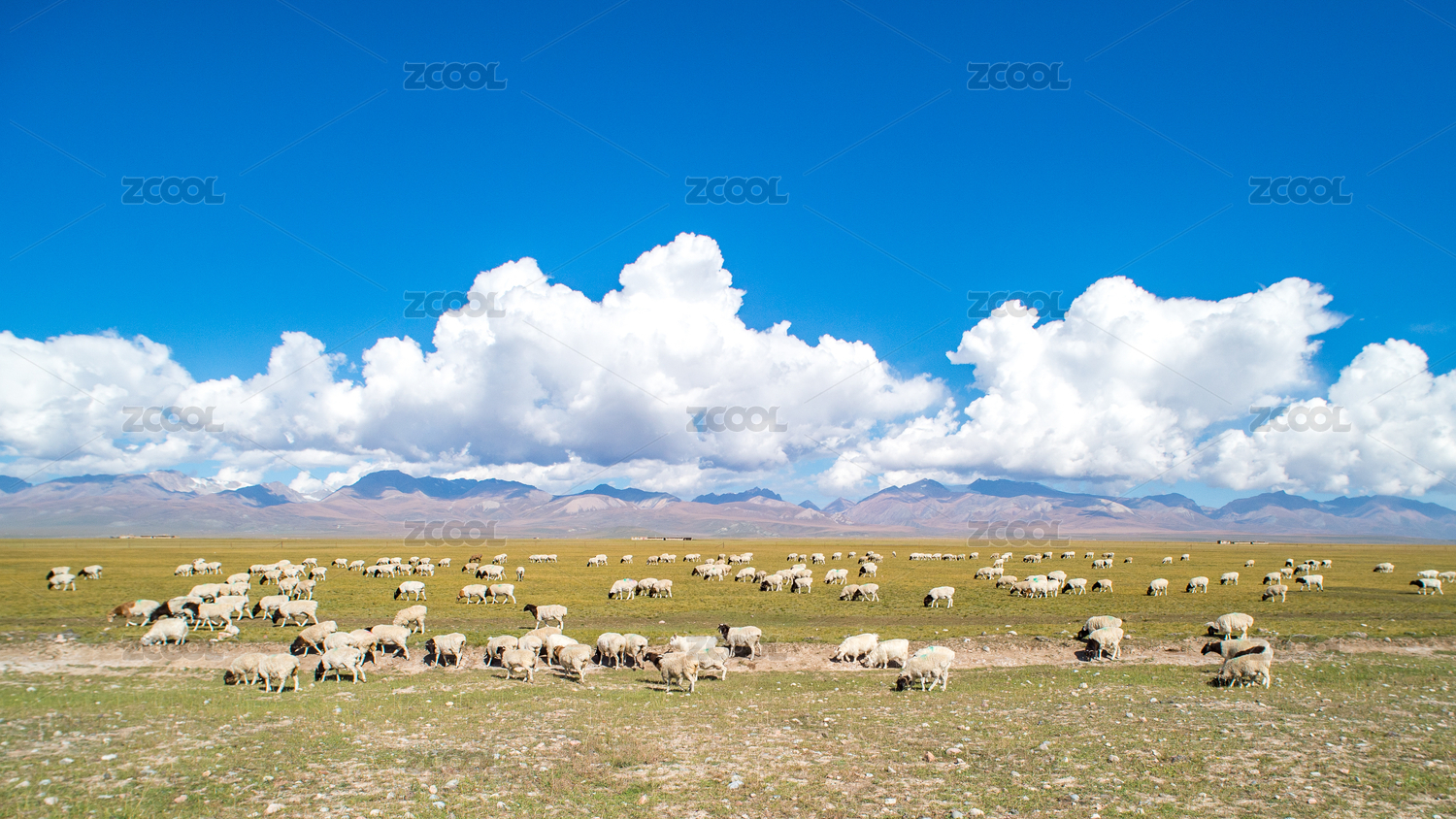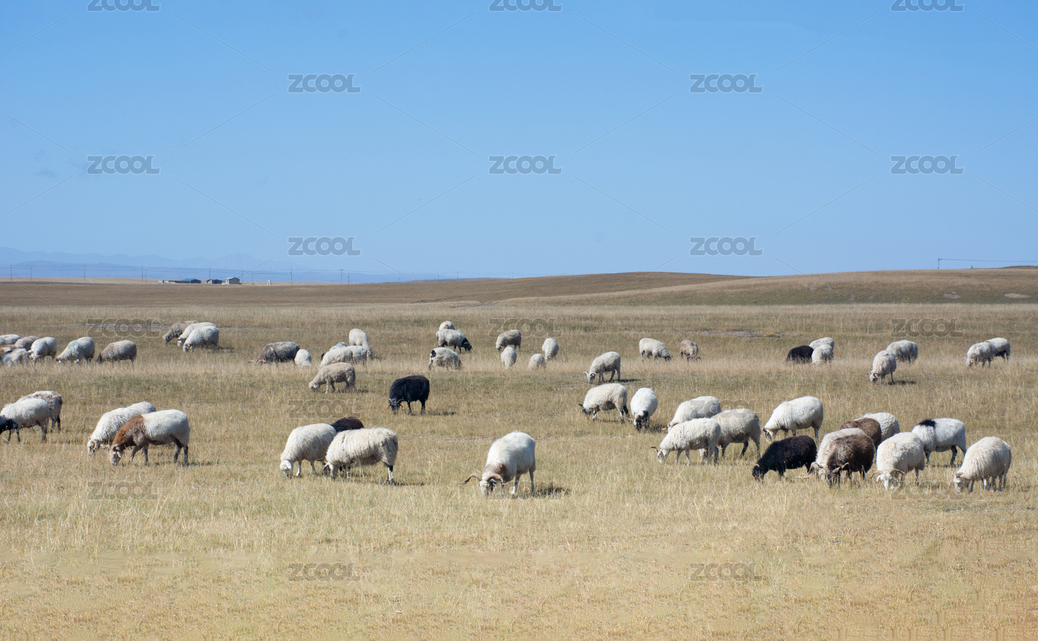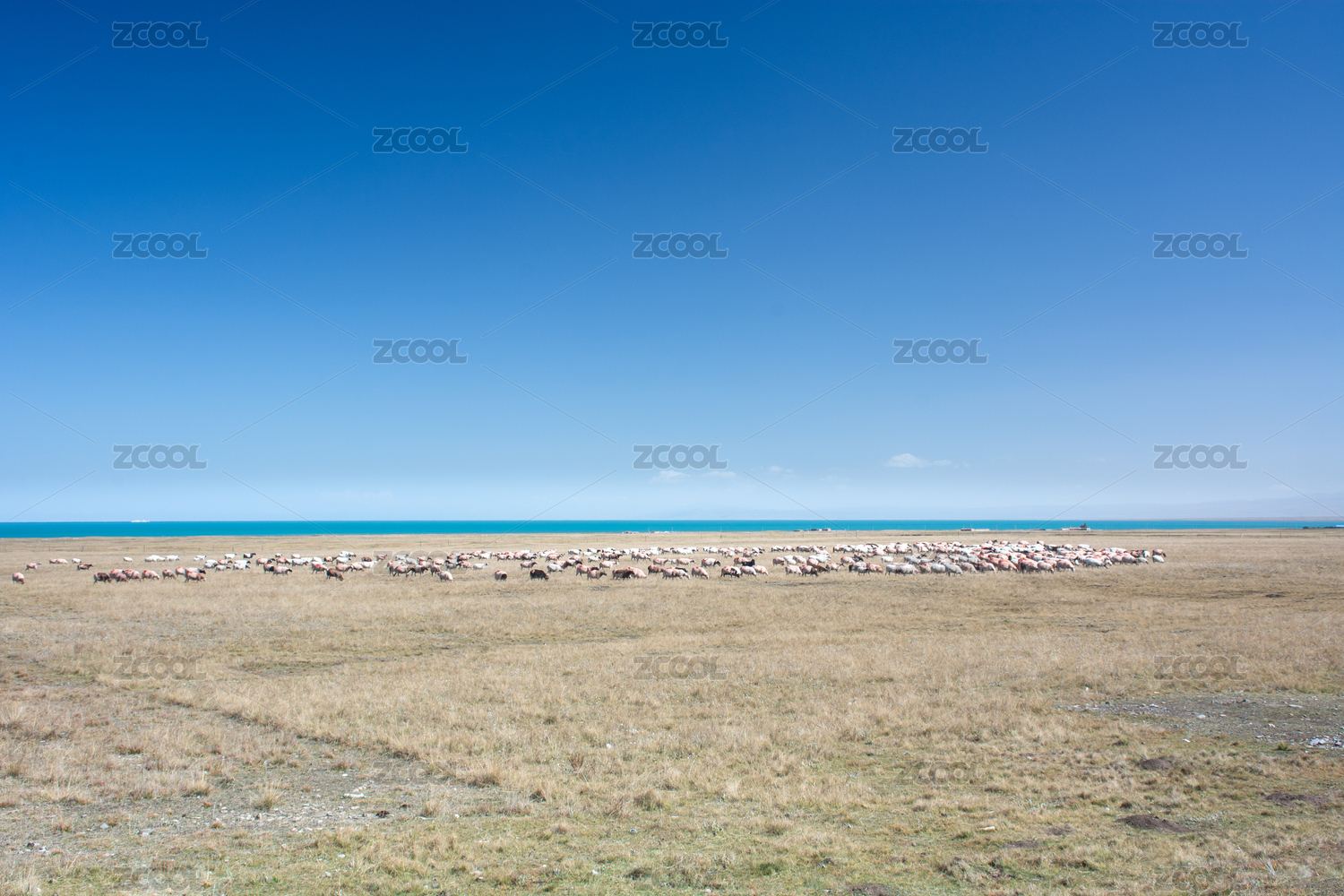 中国西部青海湖秋天高原牧场上正在吃草绵羊