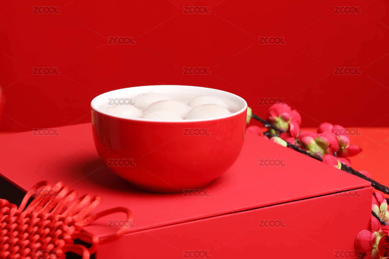 元宵节美食汤圆摆放在古窗棂红色背景上
