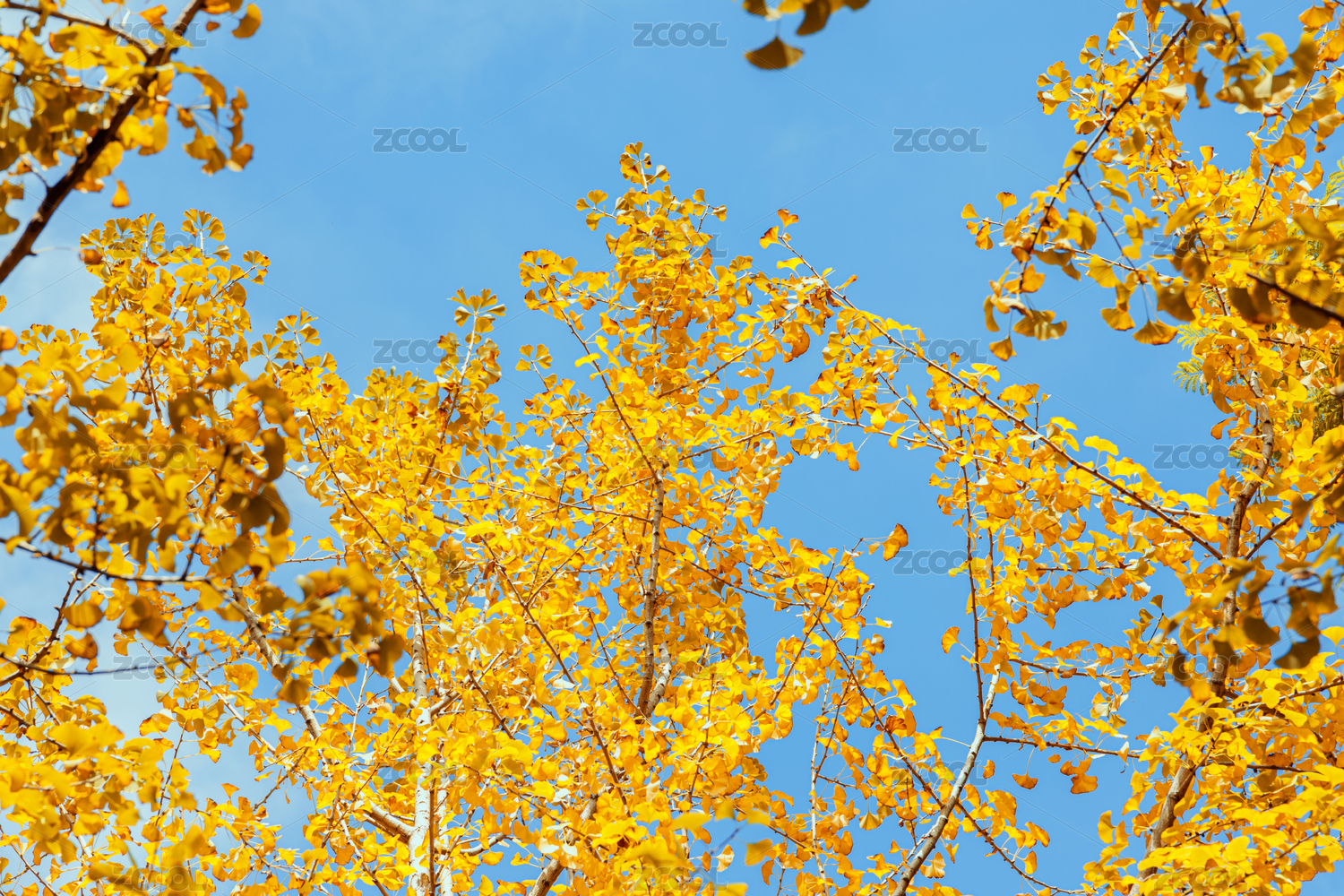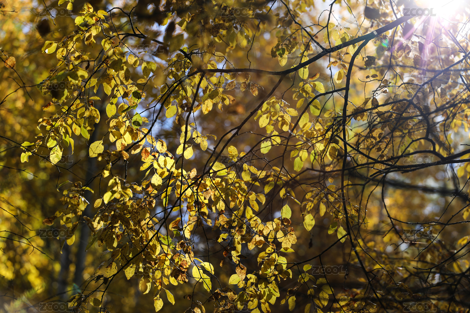 阳光下满画幅秋天金黄色树叶叶子的自然风景