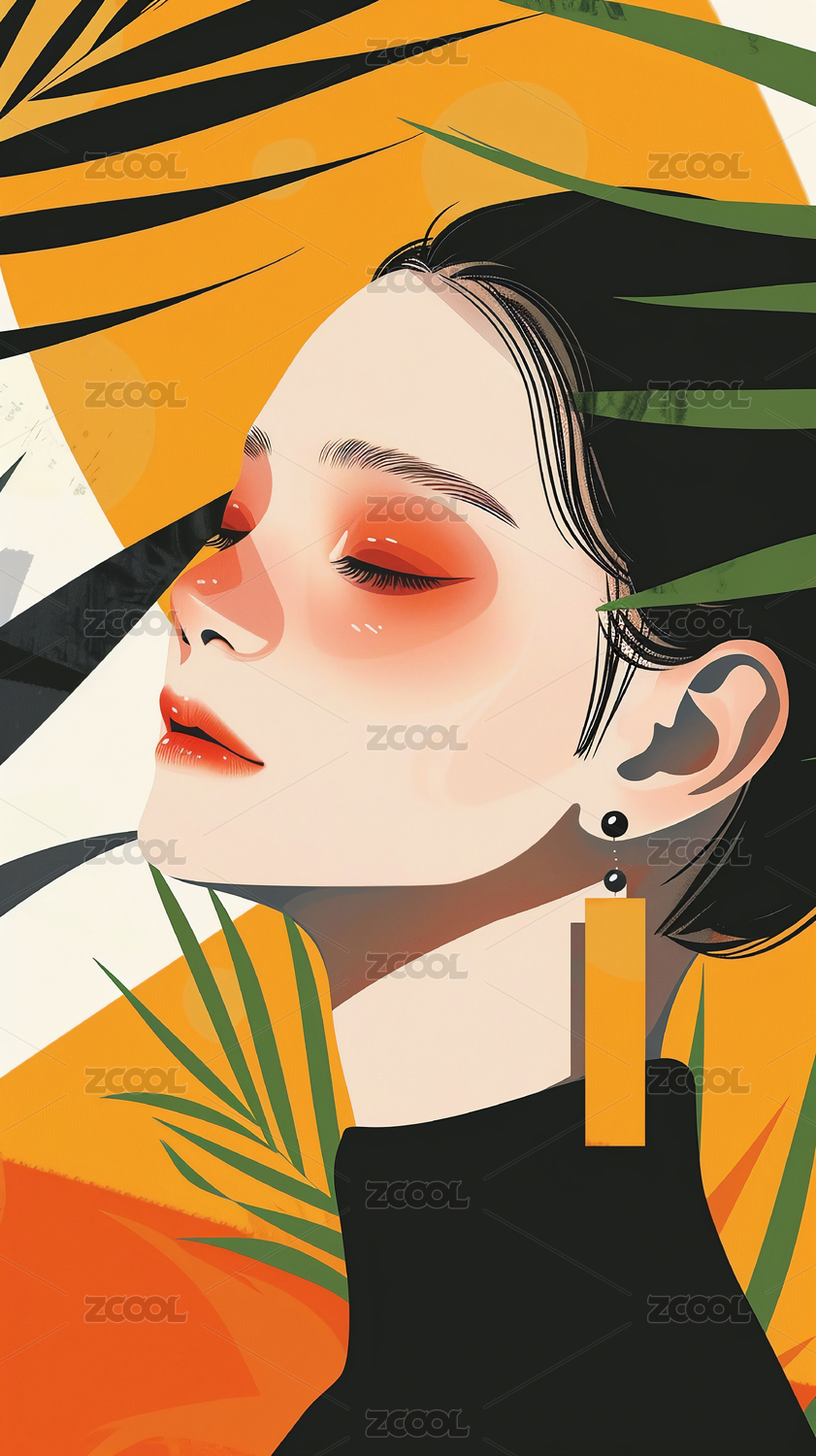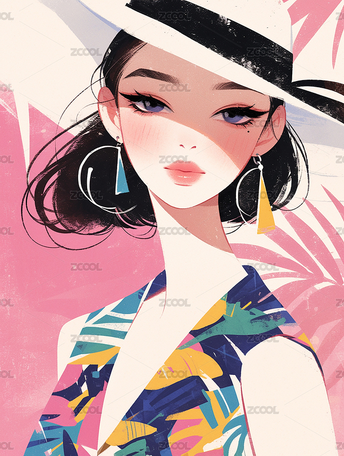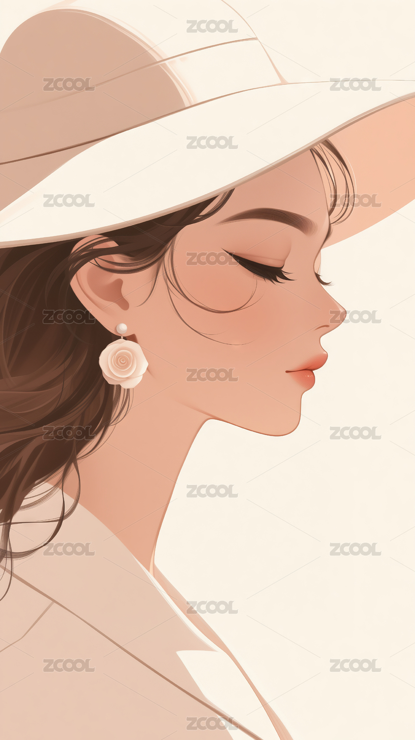 女孩,耳环,帽子,近景,对视,竖构图,植物,女生,插画